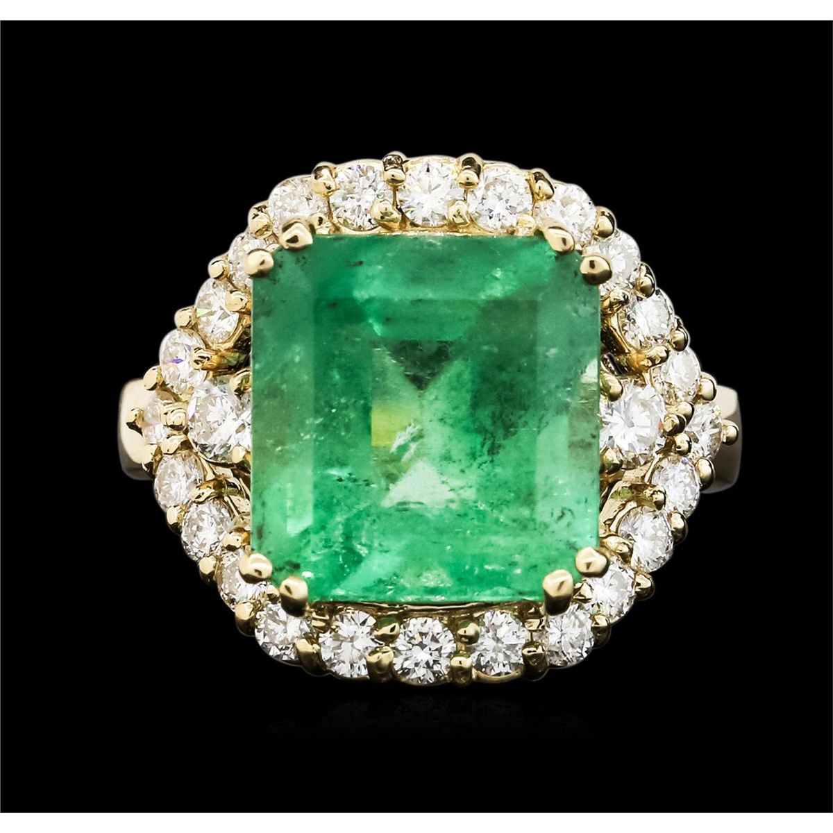 One electronically tested 14KT yellow gold ladies cast emerald & diamond ring with a bright finish. The featured emerald is set within a diamond bezel, supported by a ribbed under gallery, completed by a three millimeter wide band. Identified with markings of "K14". Condition is new, good workmanship. Containing: One prong set octagonal step cut natural emerald, measuring 11.85 x 11.26 x 7.77mm, exact weight 7.04ct., clarity is moderately included, type III, medium, very slightly grayish, green color, (GIA G 5/3), cut is good. Transmitting light somewhat diffusely, transparent to translucent. Naturally occurring internal & external characteristics are present. Indications of clarity enhancements. GIA Gemological Report attached. Graded loose prior to setting in the GIA Laboratory, Report #2161542566.Twenty-Six prong set round brilliant cut diamonds, measuring 2.90 - 2.20 x 1.53mm (depth est.) approximate total weight of 26 Stones = 1.55ct. Graded in the setting. Clarity: SI-1 to I-1. Color: G - I. Total Weight of Colored Stones 7.04ct. Total Weight of Diamonds 1.55ct. Total Weight of Ring 7.99 grams. AIG Appraised at $18,770.00.