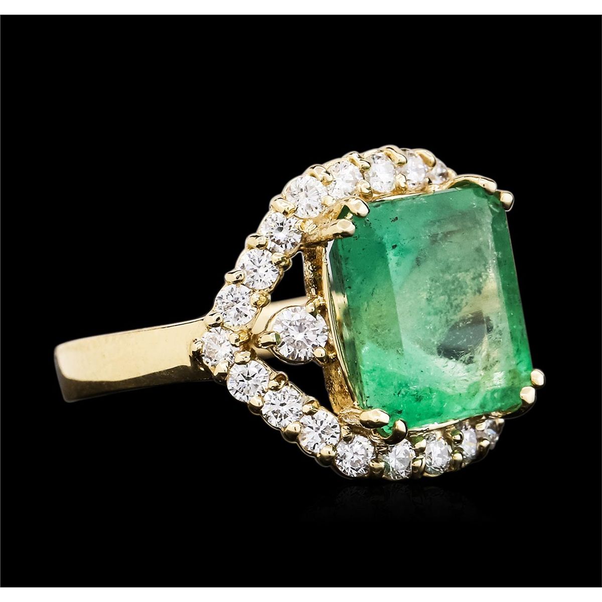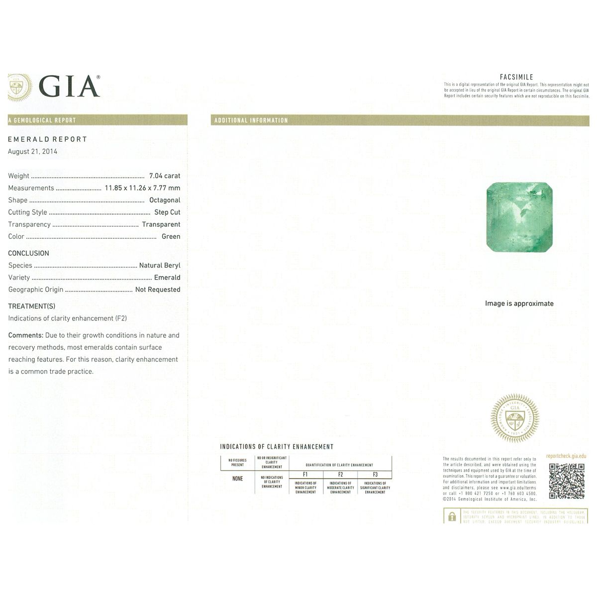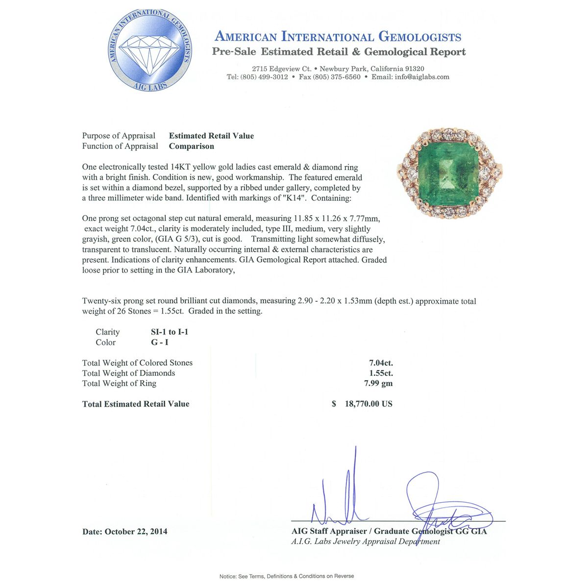 One electronically tested 14KT yellow gold ladies cast emerald & diamond ring with a bright finish. The featured emerald is set within a diamond bezel, supported by a ribbed under gallery, completed by a three millimeter wide band. Identified with markings of "K14". Condition is new, good workmanship. Containing: One prong set octagonal step cut natural emerald, measuring 11.85 x 11.26 x 7.77mm, exact weight 7.04ct., clarity is moderately included, type III, medium, very slightly grayish, green color, (GIA G 5/3), cut is good. Transmitting light somewhat diffusely, transparent to translucent. Naturally occurring internal & external characteristics are present. Indications of clarity enhancements. GIA Gemological Report attached. Graded loose prior to setting in the GIA Laboratory, Report #2161542566.Twenty-Six prong set round brilliant cut diamonds, measuring 2.90 - 2.20 x 1.53mm (depth est.) approximate total weight of 26 Stones = 1.55ct. Graded in the setting. Clarity: SI-1 to I-1. Color: G - I. Total Weight of Colored Stones 7.04ct. Total Weight of Diamonds 1.55ct. Total Weight of Ring 7.99 grams. AIG Appraised at $18,770.00.