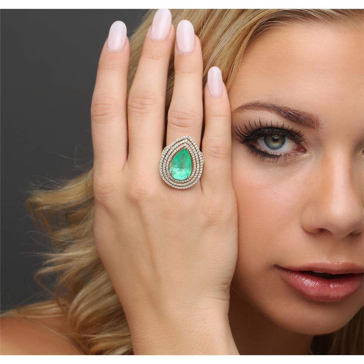 One electronically tested 14KT yellow gold ladies cast emerald & diamond ring with a bright finish. The featured emerald is set within tiered diamond bezels, supported by diamond set shoulders and an elaborate under gallery, completed by a three millimeter wide band. Identified with markings of 14K. Condition is new, good workmanship. Containing: One prong set pear mixed cut natural emerald, measuring 17.15 x 11.49 x 8.05mm, exact weight 7.70ct., clarity is moderately included, medium, very slightly grayish, very slightly greenish blue color, (GIA vslgB 5/3), cut is good. Transmitting light somewhat diffusely, transparent to translucent. Naturally occurring internal & external characteristics are present. Indications of clarity enhancement. Graded loose prior to setting in the GIA Laboratory, Report # 2161542597. The GIA Report is attached. Two Hundred Eight prong set round brilliant cut diamonds, measuring 1.40 - 1.00 x 0.72mm (depth est.) approximate total weight of 208 Stones = 1.20ct. Graded in the setting. Clarity: SI-1 to I-1. Color: G - H. Total Weight of Colored Stones 7.70ct. Total Weight of Diamonds 1.20ct. Total Weight of Ring 9.35 grams. AIG Appraised at $25,990.00.