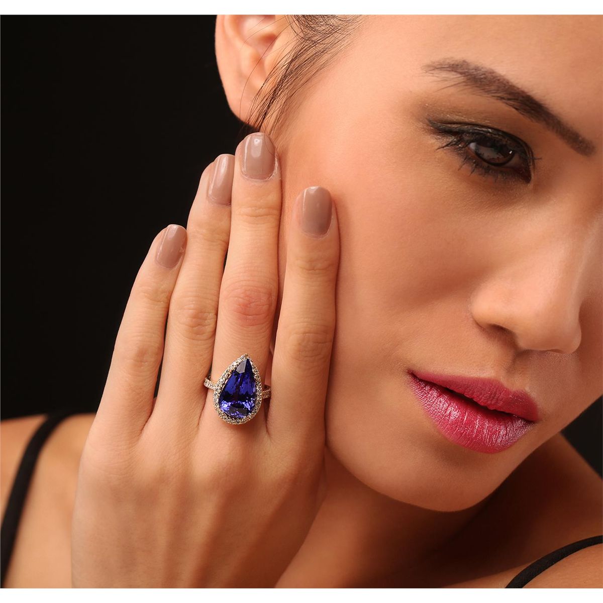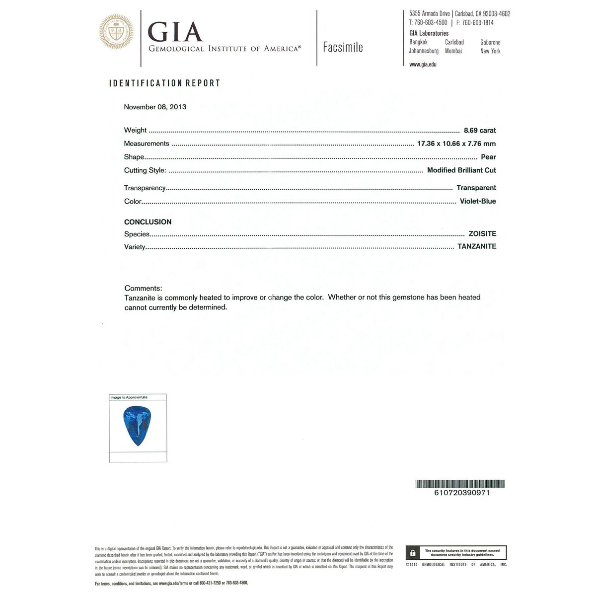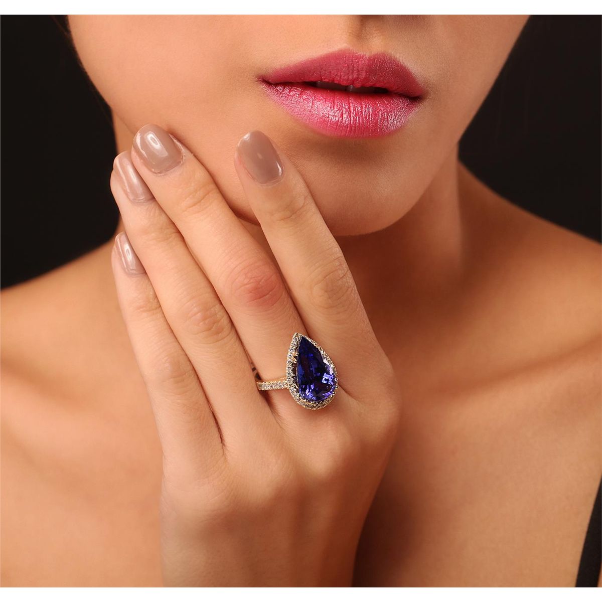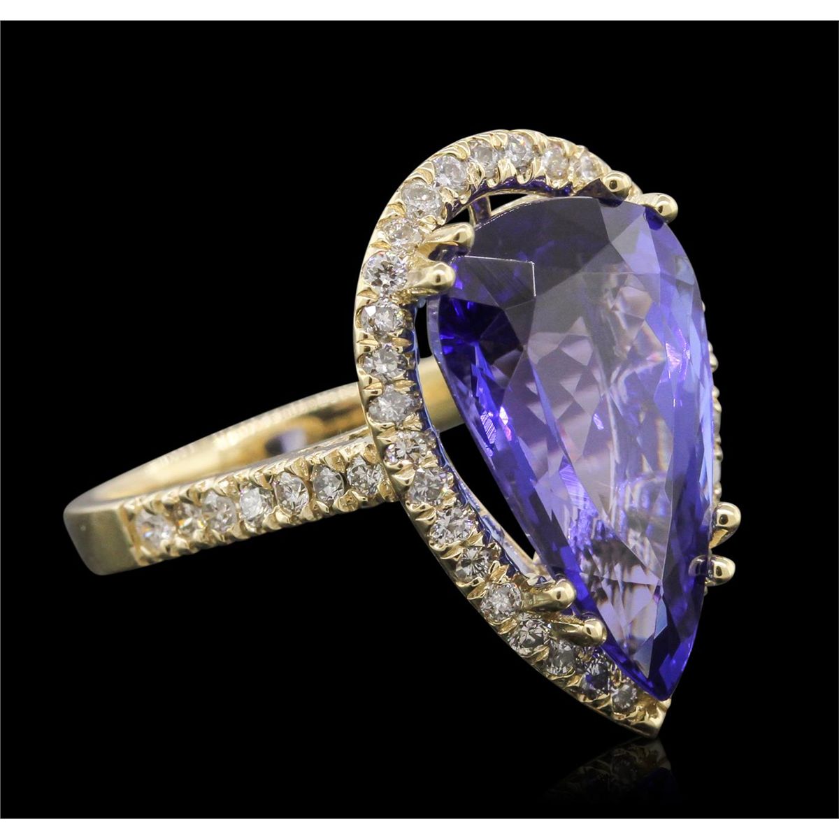 One electronically tested 14KT yellow gold ladies cast tanzanite and diamond ring with a bright polish finish. Condition is new, good workmanship. The featured tanzanite is set within a diamond bezel , supported by diamond set shoulders and completed by a two and one-half millimeter wide band. Identified with markings of "K14". Containing: One prong set pear modified brilliant cut natural tanzanite, measuring 17.36 x 10.66 x 7.76mm, exact weight 8.69ct., clarity is eye clean, type I, cut is good. Clarity is eye clean, medium dark, very slightly grayish, Violet-Blue color, (GIA VB 6/3), cut is good. Transmitting light with no distortion, transparent. GIA Gemological Report attached. Graded loose prior to setting in the GIA Laboratory, Report # 2151735554.Tanzanite is a very rare gemstone that is only found in the country of Tanzania. Originally discovered in 1967. Tiffany & Company, named the stone Tanzanite. It is found in the Usumburu Mountains that border the Umba Valley of northern Tanzania. Tanzanite occurs in gray, brown, violet, blue, reddish-purple, & green. The gem is interesting because of its exceptional pleochroism. Rotated in different directions a tanzanite will exhibit multiple changes of color. Tanzanite has a low tolerance to ultrasonic cleaning, and should not be cleaned using this method. Forty-Seven prong set round brilliant cut diamonds, measuring 1.60 - 1.40 x 0.90mm (depth est.) approximate. Total Weight of 47 Stones = 0.67ct. Graded in the setting. Clarity: SI-2 to I-2. Color: I - K. Total Weight of Colored Stones 8.69ct. Total Weight of Diamonds 0.67ct. Total Weight of Ring 6.20 grams. AIGAppraised at $26,380.00.