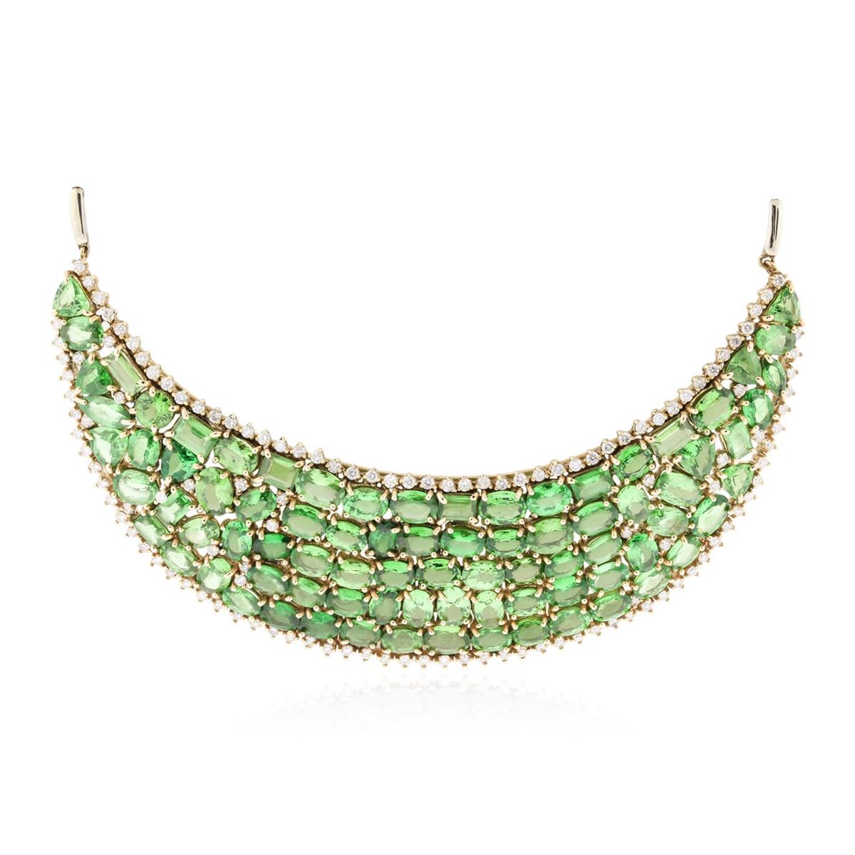 One electronically tested 14KT yellow gold ladies hand made Vintage garnet and diamond necklace with a hidden box clasp with safety closer with a bright polish finish. Measurements: 17.5" in length Identified with markings of "14K". Condition is very good. Containing: Eighty-two prong set oval modified brilliant cut natural tsavorite garnets, measuring 7.70 x 5.30 x 3.45mm, approximate total weight of 82.00.ct., clarity is eye clean, type II, medium, very slightly grayish, green to yellowish green color, (GIA yG 5/3), cut is good. Graded by GIA in the setting. GIA Report: 6157767366 November 26, 2013. One Hundred Fifteen prong set round brilliant cut diamonds, measuring 1.60 - 1.30 x 0.87mm (depth est.) approximate total weight of 115 Stones = 1.28ct. Clarity: SI-2. Color: J - K, Cut is Good. Colored gemstones are presumed to have been subjected to commonly used enhancement processes. All diamonds and colored gemstones are graded in the mounting, unless otherwise stated. Total Weight of Colored Stones 82.00.ct. Total Weight of Diamonds 1.28ct. Total Weight of Necklace 72.00. grams. GGL Appraised at $60,675.00.