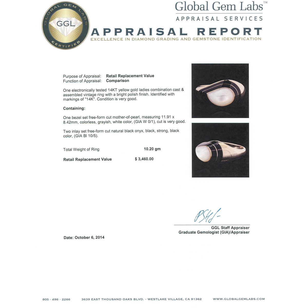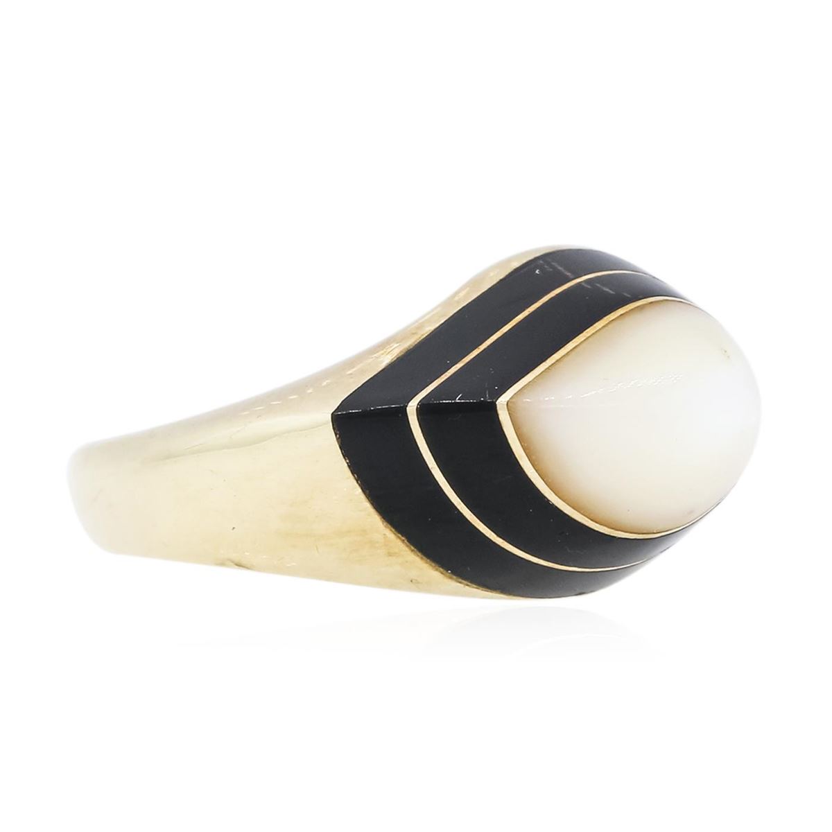 One electronically tested 14KT yellow gold ladies combination cast & assembled vintage ring with a bright polish finish. Identified with markings of "14K". Condition is very good. Containing: One bezel set free-form cut mother-of-pearl, measuring 11.91 x 8.42mm, colorless, grayish, white color, (GIA W 0/1), cut is very good. Two inlay set free-form cut natural black onyx approximate, black, strong, black color, (GIA Bl 10/5). Total Weight of Ring 10.20 grams. GGL Appraised at $3,460.00.
