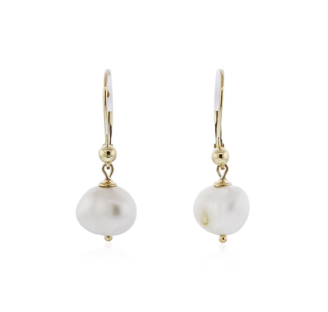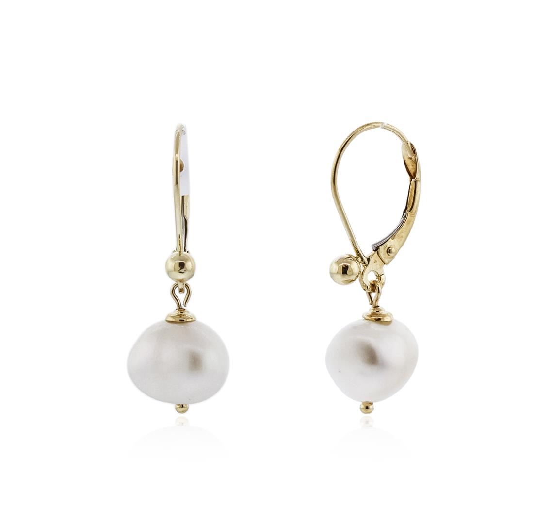 One pair of dangle earrings featuring: 14KT yellow gold weighing 2.70 grams containing two pearls measuring 7.00mm.