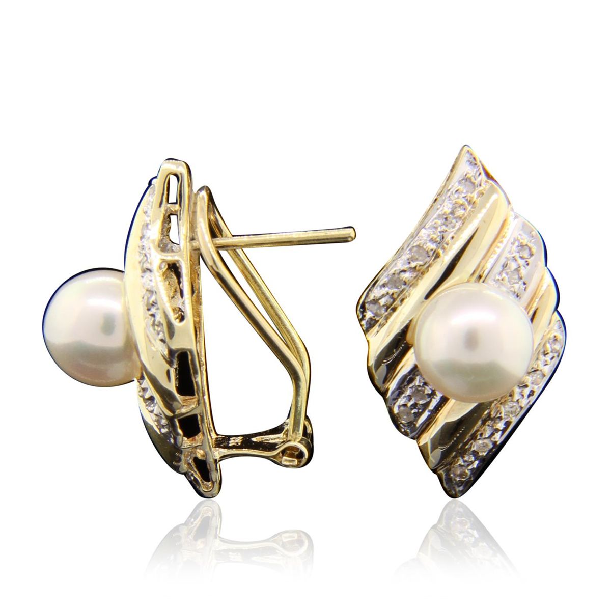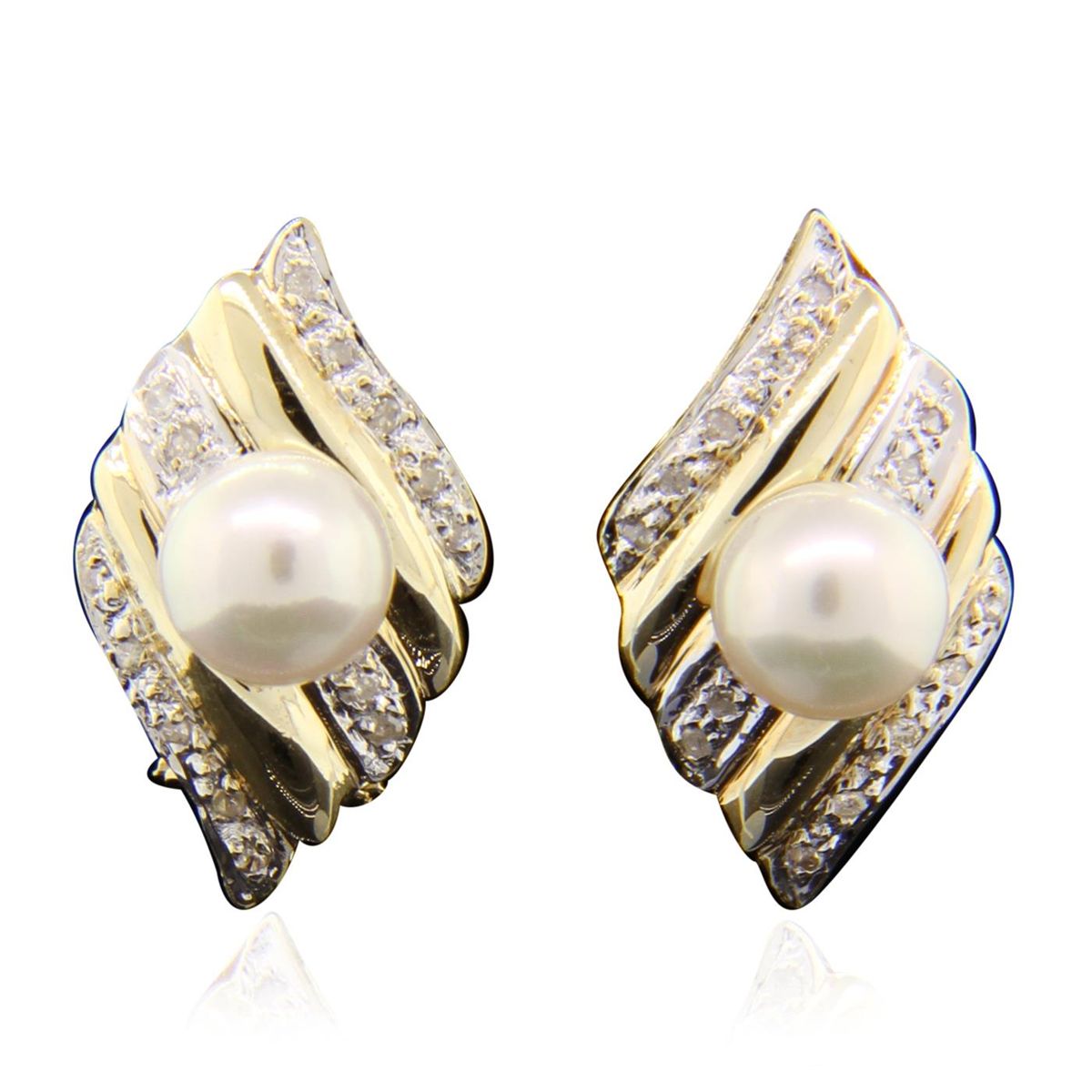 One pair of earrings featuring: 6.00 grams of 14KT yellow gold, (1) pearl and 0.15cts of diamonds.