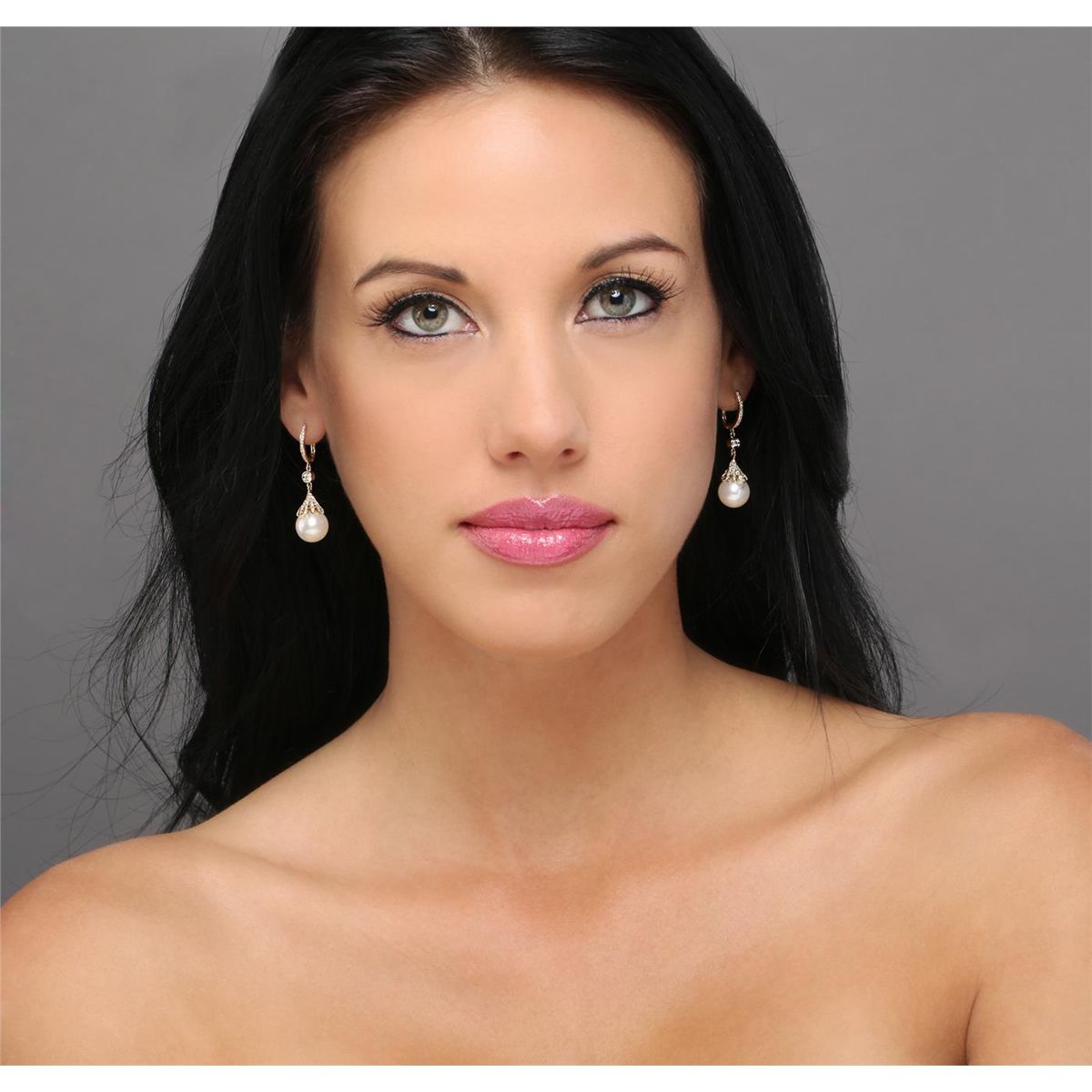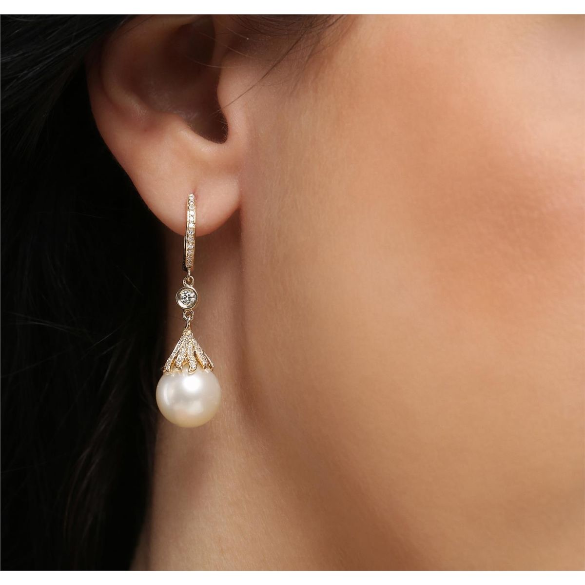 One pair of earrings featuring: 14KT yellow gold weighing 6.40 grams containing two pearls measuring 10.50mm and diamonds with a total weight of 0.50cts.