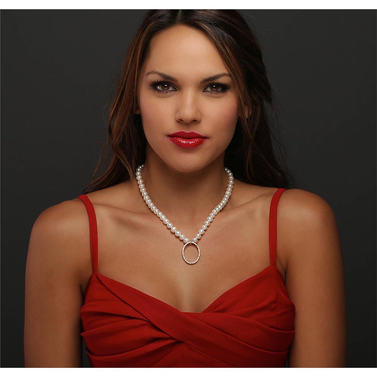 One electronically tested 14KT yellow gold ladies cast & assembled akoya cultured pearl and diamond necklace. Seventeen inch length necklace features a diamond set oval pendant supported by an akoya cultured pearl ribbon with two seed pearl accents, terminating in a lobster claw clasp. Bright polish finish. Identified with markings of "14K". Condition is new, good workmanship. Containing: 59 akoya cultured pearls, 7.5mm in size to 8.0mm in size. The pearls are cream rose' in color with a high luster, thick nacre, off-round, lightly spotted with good uniformity Graded in the strand. Akoya Cultured Pearls are farmed in the ocean waters around the countries of Japan and China. In Japan the main culturing areas are near Ehime, Kumamoto, and Nagasaki. In China, the main culturing areas are Hainan Island, Chenghai Guangdong, and Liusha Zhangjiang. Liusha is known in China as the Country of Akoya Pearls. The Akoya oyster Pinctada Fucata Martensii is the smallest pearl-producing oyster. The cultured pearl is produced by inserting a nuclei and a small piece of mantle tissue into the oyster. Akoya pearls tend to range in size from about 4 to 8 millimeters and consistently are round and or near-round. The Akoya pearl takes from two to three years to form. Akoya pearls are the pearls most often used in necklaces. They are generally white or cream colored, and have overtones of rose, pink, cream, and or green. The development of the modern pearl culturing technique is due to the work of one man, Kokichi Mikimoto who began work on this idea in the late 19th century. The Japanese Akoya cultured pearl became the first pearl to be cultured in a steady reliable production. Forty prong set round brilliant cut diamonds, measuring 1.90 - 1.80 x 1.11mm (depth est.) approximate total weight of 40 Stones = 1.02ct. Graded in the setting. Clarity: I-1 to I-2. Color: G - I. Total Weight of Diamonds 1.02ct. Total Weight of Necklace 45.32 grams. AIG Appraised at $4,280.00.