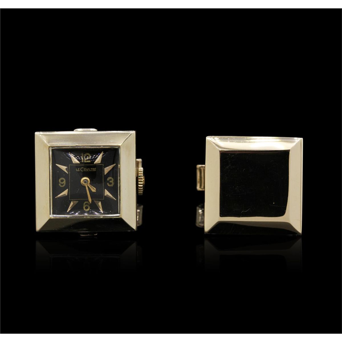 One pair electronically tested 14KT yellow gold mens combination cast & assembled Le Coultre Watch cufflinks with a bright polish finish. The watch has Swiss made self-winding movement, black dial with yellow gold markers and matching hands. Measurements of the watch: 17.40mm x 17.40mm. Identified with markings of "14K". Condition is very good. Total Weight of Cufflinks 16.40 grams. GGL Appraised at $2,840.00.