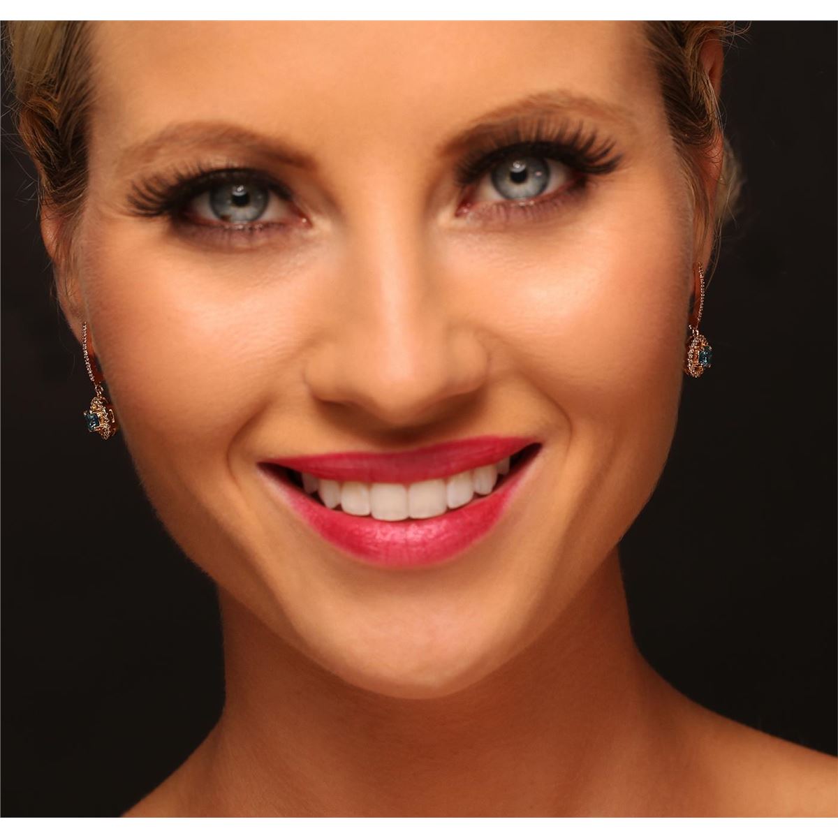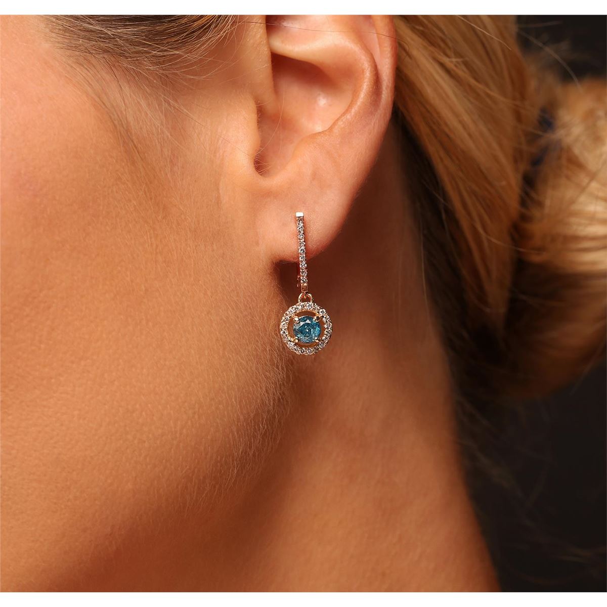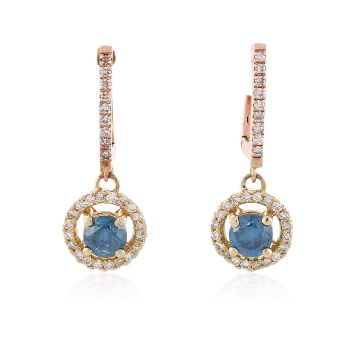 One pair electronically tested 14KT yellow and rose gold ladies cast & assembled diamond earrings with hinged, snap locking posts. Condition is new, good workmanship. Each earring features a diamond set within a yellow gold diamond bezel dangle, completed by a rose gold diamond set huggie. Bright polish finish. Identified with markings of "585". Containing: Two prong set round brilliant cut diamonds, measuring 5.05 - 5.00 x 3.70mm (depth est.), 8.00.%. GTCF approximate. Total Weight of 2 Stones = 1.58ct. Color grade is an average for the pair. Indications of laboratory irradiated enhanced color. Graded in the setting. Clarity: I-1 to I-2 Sixty prong set round brilliant cut diamonds, measuring 1.30 - 1.30 x 0.78mm (depth est.) approximate. Total Weight of 60 Stones = 0.50ct. Graded in the setting. Clarity: SI-1 to I-1. Color: G - I. Total Weight of Diamonds 2.08ct. Total Weight of Earrings 4.41 grams. AIG Appraised at $9,010.00.