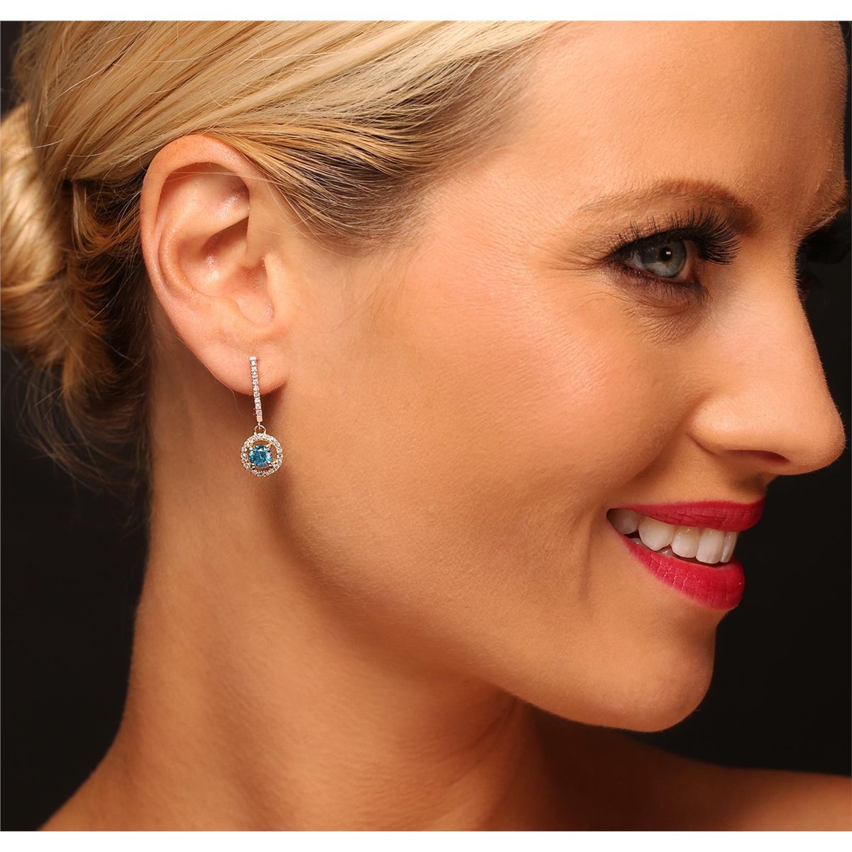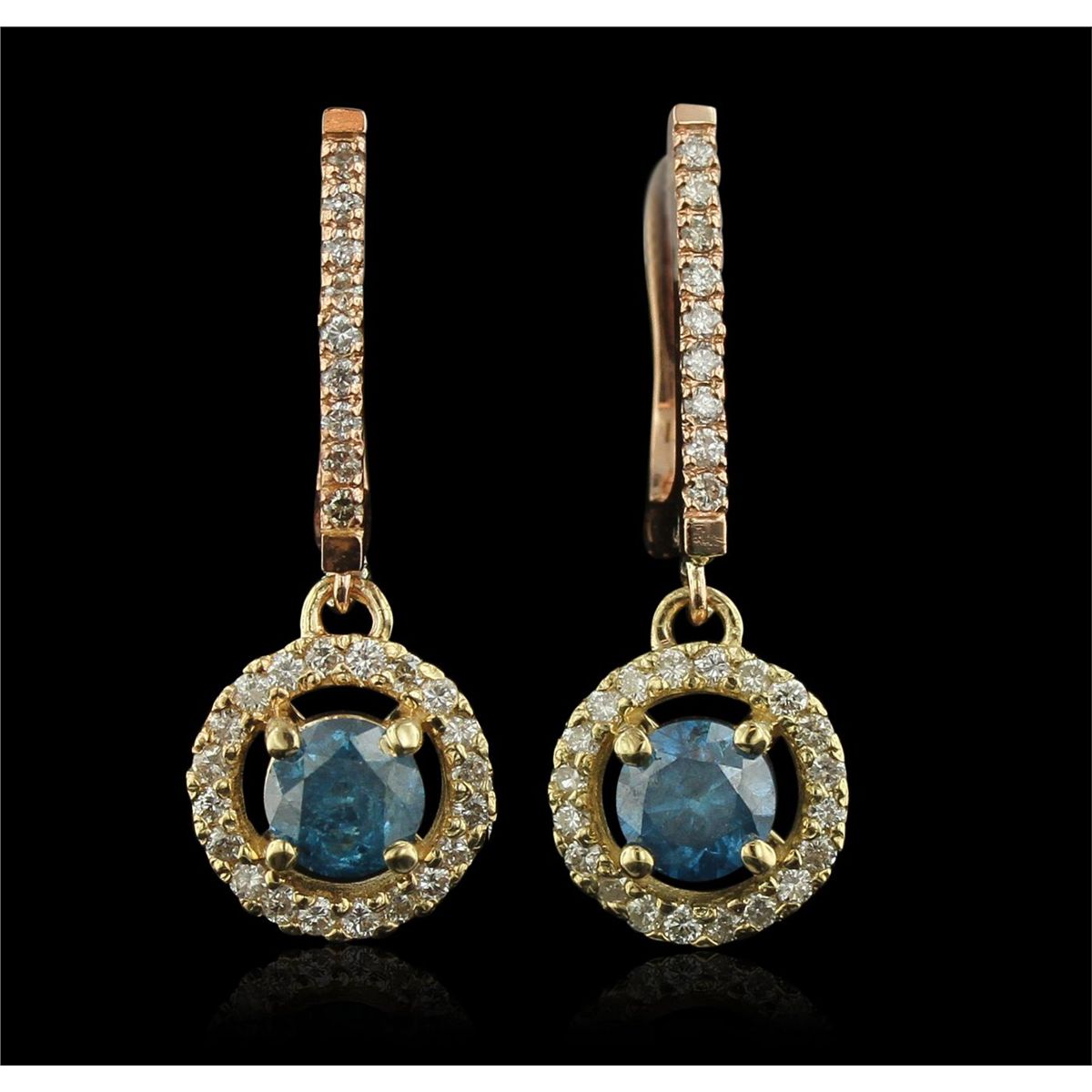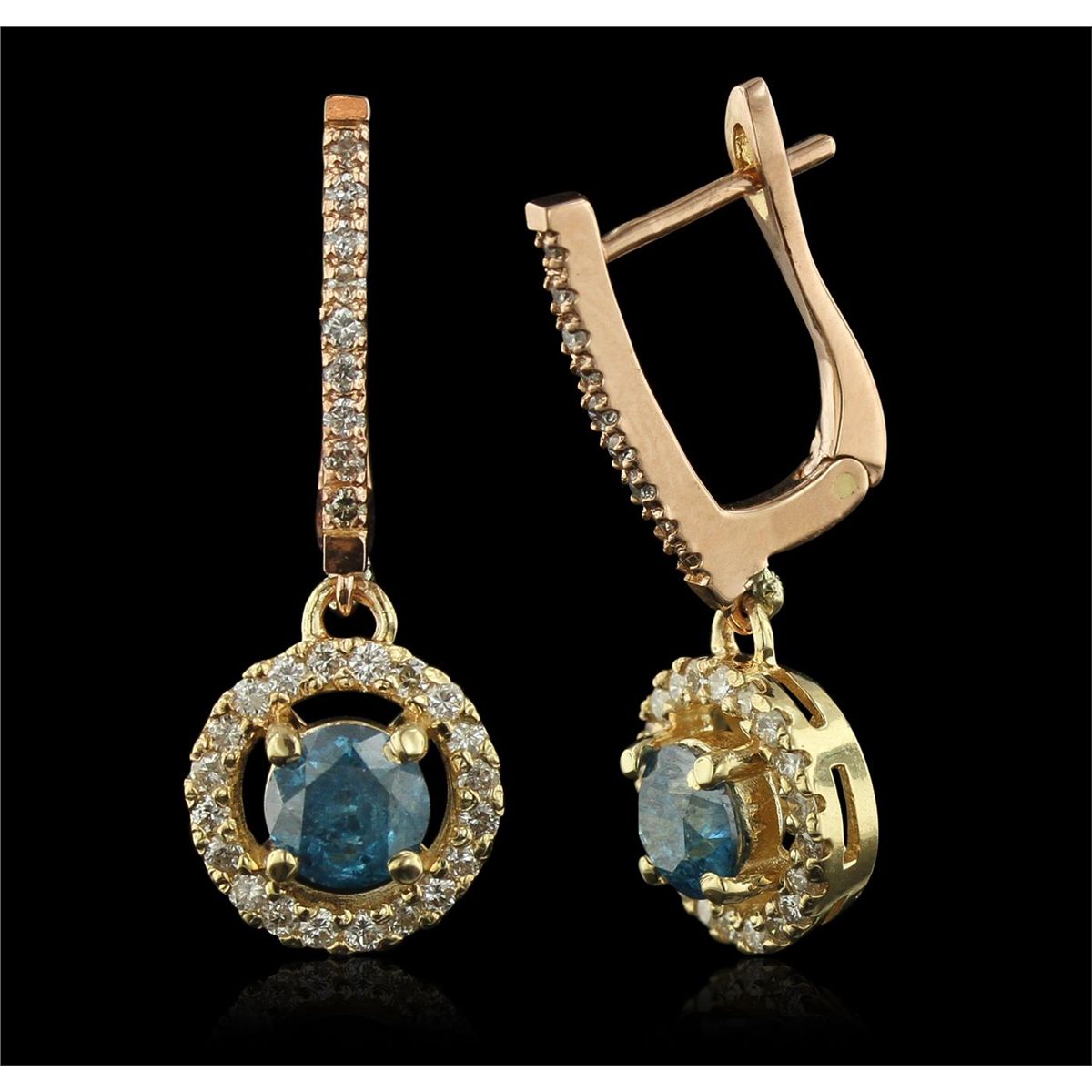 One pair electronically tested 14KT yellow and rose gold ladies cast & assembled diamond earrings with hinged, snap locking posts. Condition is new, good workmanship. Each earring features a diamond set within a yellow gold diamond bezel dangle, completed by a rose gold diamond set huggie. Bright polish finish. Identified with markings of "585". Containing: Two prong set round brilliant cut diamonds, measuring 5.05 - 5.00 x 3.70mm (depth est.), 8.00.%. GTCF approximate. Total Weight of 2 Stones = 1.58ct. Color grade is an average for the pair. Indications of laboratory irradiated enhanced color. Graded in the setting. Clarity: I-1 to I-2 Sixty prong set round brilliant cut diamonds, measuring 1.30 - 1.30 x 0.78mm (depth est.) approximate. Total Weight of 60 Stones = 0.50ct. Graded in the setting. Clarity: SI-1 to I-1. Color: G - I. Total Weight of Diamonds 2.08ct. Total Weight of Earrings 4.41 grams. AIG Appraised at $9,010.00.