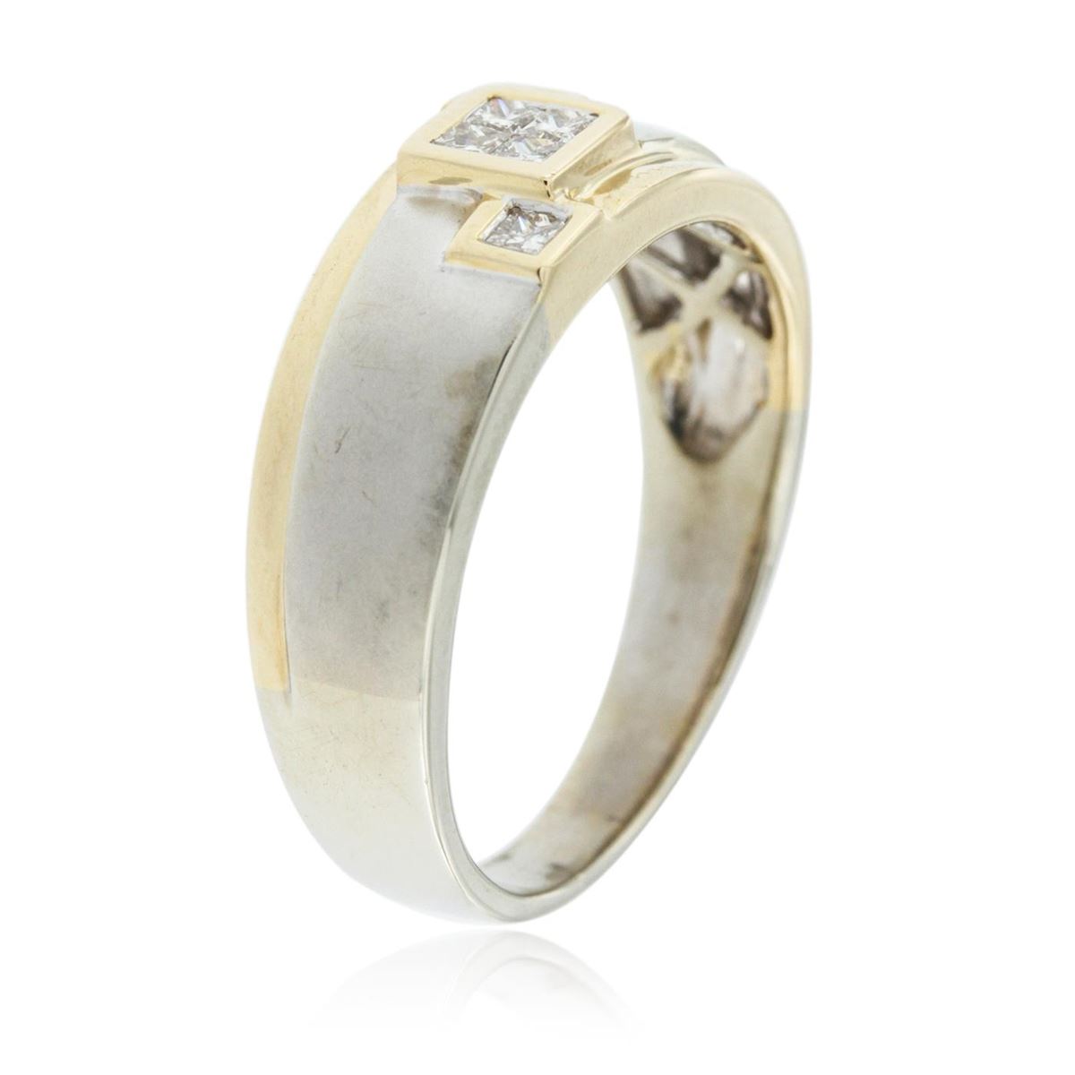 One electronically tested 14KT yellow and white gold man's combination cast & assembled ring with a bright polish finish. Condition is very good. Identified with markings of "14K". Containing: Six invisible set princess cut diamonds, measuring 1.80 x 1.80 x 1.35mm (depth est.) approximate. Total Weight of 6 Stones = 0.22ct. Clarity: VS-2 to SI-1. Color: I - J, Cut is Very Good. Total Weight of Diamonds 0.22ct. Total Weight of Ring 6.00gm. GGL Appraised at $3,010.00.