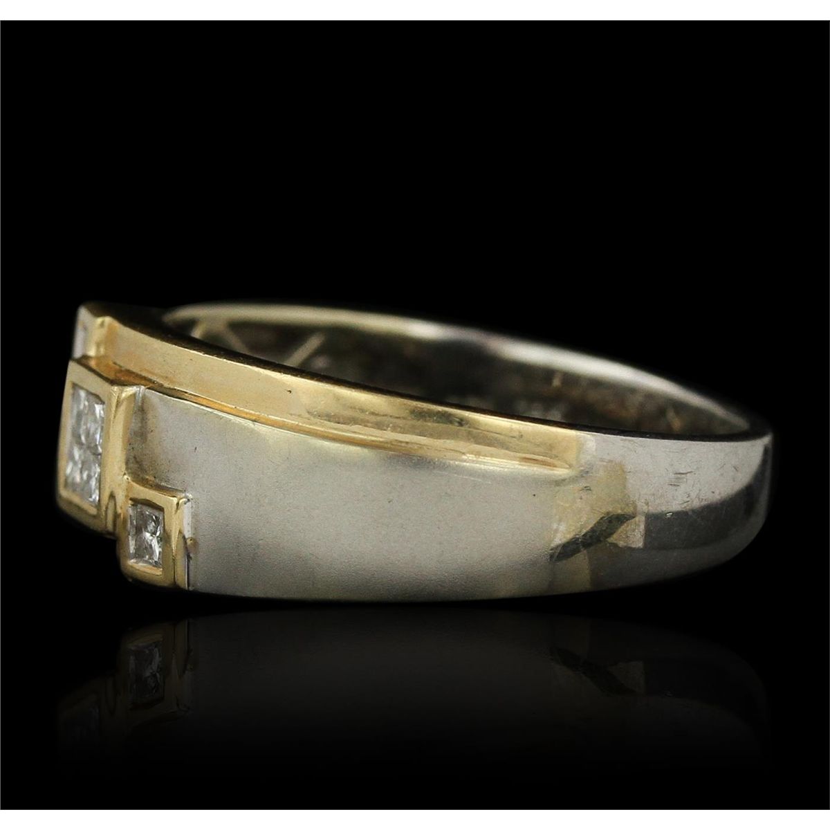 One electronically tested 14KT yellow and white gold man's combination cast & assembled ring with a bright polish finish. Condition is very good. Identified with markings of "14K". Containing: Six invisible set princess cut diamonds, measuring 1.80 x 1.80 x 1.35mm (depth est.) approximate. Total Weight of 6 Stones = 0.22ct. Clarity: VS-2 to SI-1. Color: I - J, Cut is Very Good. Total Weight of Diamonds 0.22ct. Total Weight of Ring 6.00gm. GGL Appraised at $3,010.00.