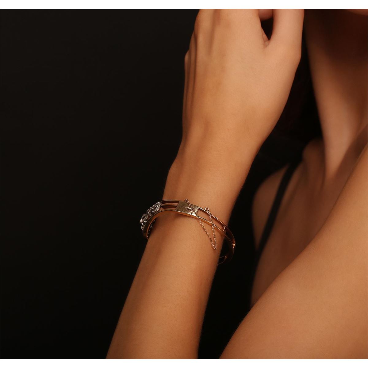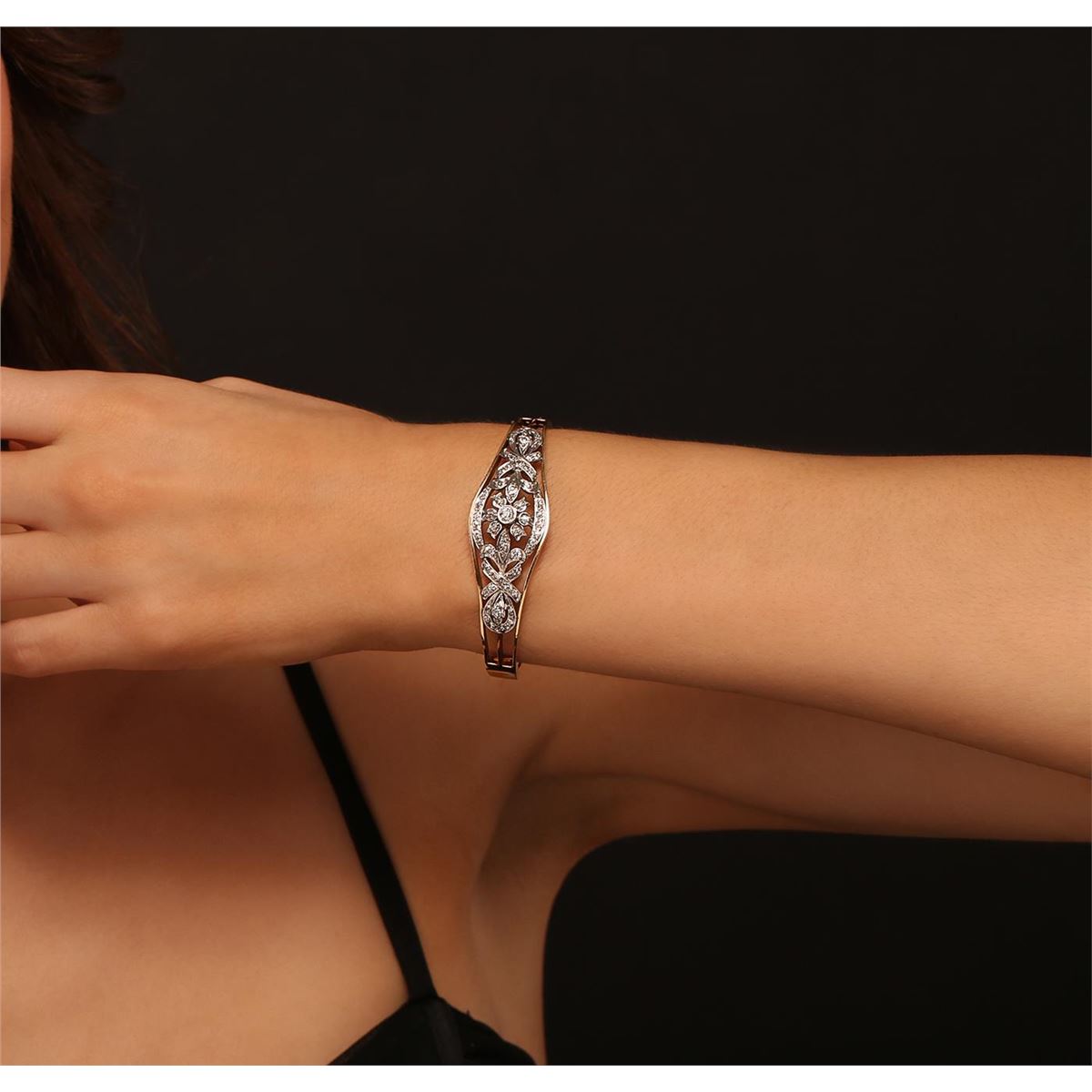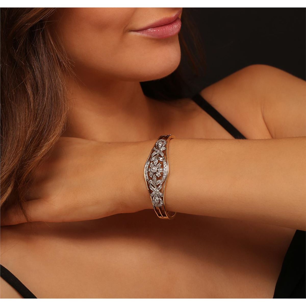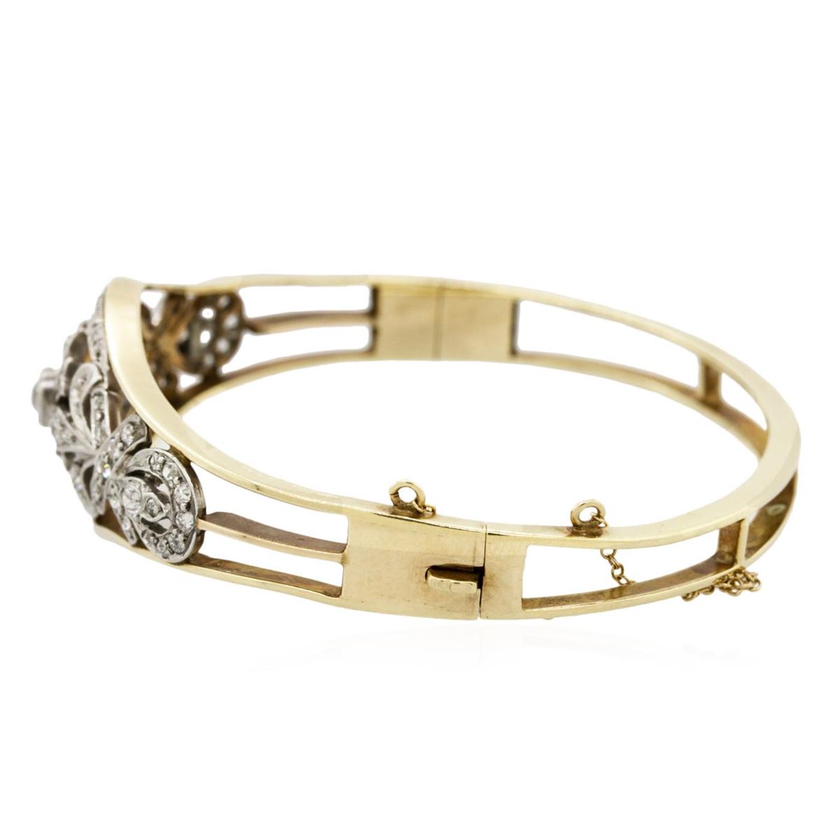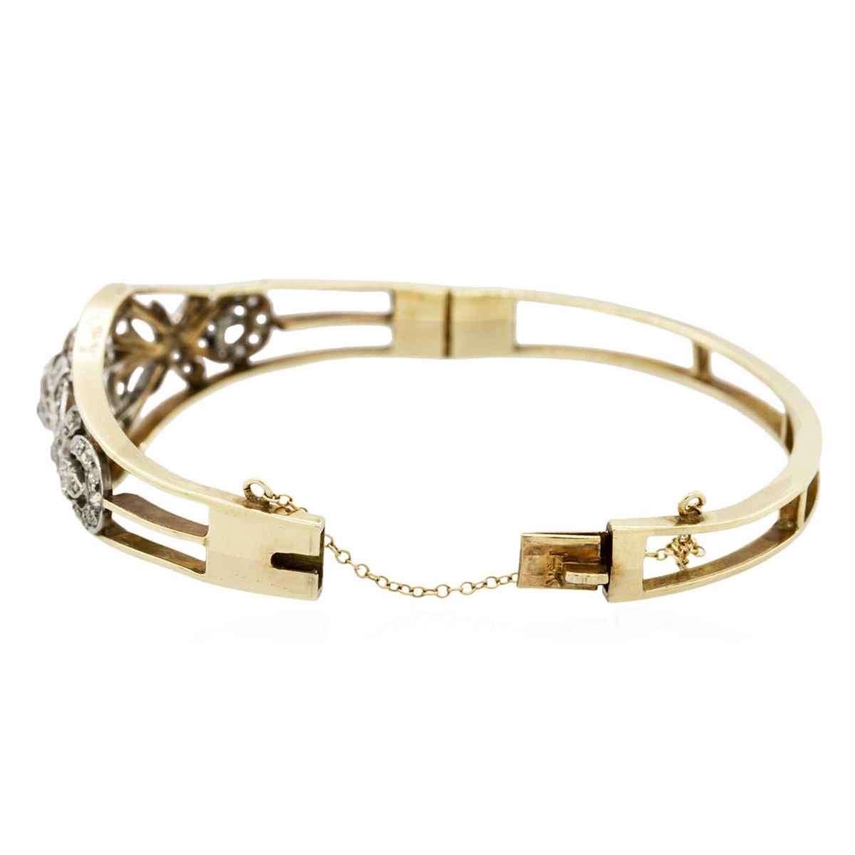 One electronically tested 14KT yellow and white gold ladies cast & assembled diamond bangle bracelet with a bright polish finish. Condition is good. Six and one-half inch wearable length bangle bracelet features a diamond set lattice gallery supported by a hinged shoulder, terminating in a concealed clasp with safety chain. Identified with markings of "14K". Containing: One bezel set Old European cut diamond, measuring 3.80 - 3.70 x 2.50mm (depth est.) approximate weight of 0.25ct. Cutting style circa late 19th century. Graded in the setting. Clarity: SI-1. Color: I Eight bead set Old European cut diamonds, measuring 2.90 - 2.50 x 1.67mm (depth est.) approximate. Total Weight of 8 Stones = 0.69ct. Cutting style circa late 19th century. Graded in the setting. Clarity: VS-2 to SI-1. Color: I - J Fifty-Eight bead set Old European cut diamonds, measuring 1.70 - 1.50 x 0.99mm (depth est.) approximate. Total Weight of 58 Stones = 0.99ct. Cutting style circa late 19th century. Graded in the setting. Clarity: VS-2 to SI-2. Color: H - J. Total Weight of Diamonds 1.93ct. Total Weight of Bangle Bracelet 20.70 grams. AIG Appraised at $9,365.00.