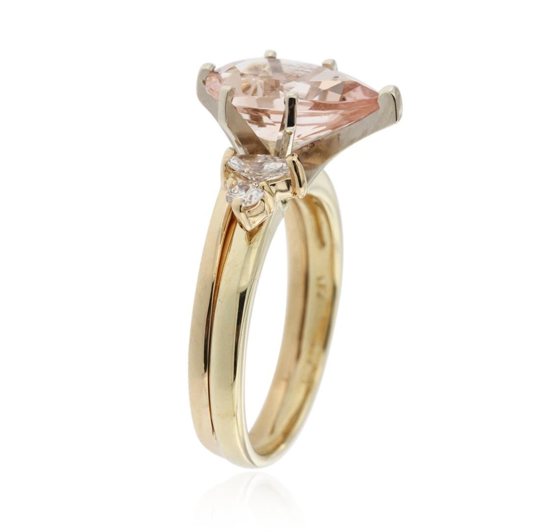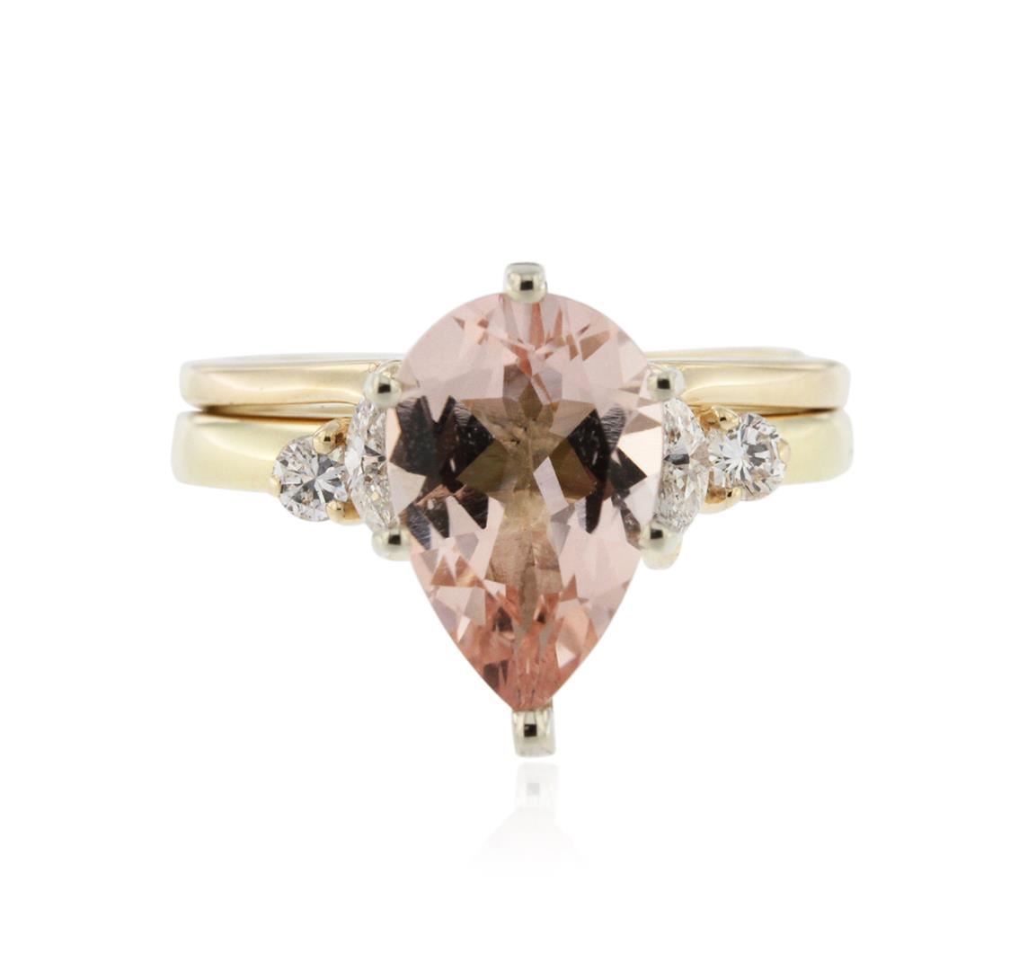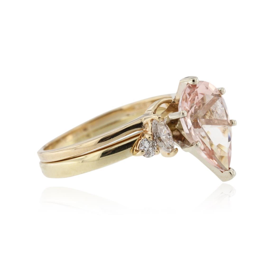 One ring featuring: 14KT yellow and white gold weighing 4.3 grams containing one pear cut morganite center weighing 2.21ct and diamonds weighing a total of 0.20ct.