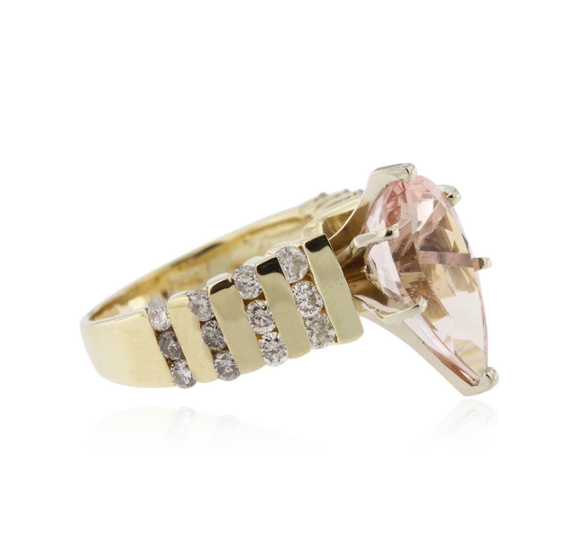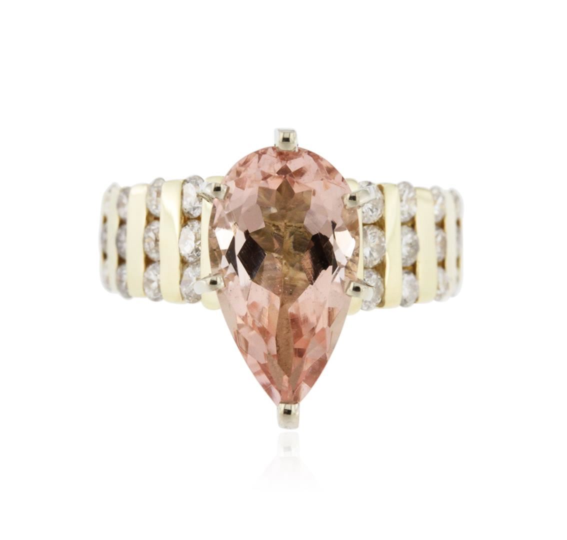 One ring featuring: 14KT yellow and white gold weighing 6.17 grams containing one pear cut morganite center weighing 3.18ct and round diamonds weighing a total of 0.50ct.