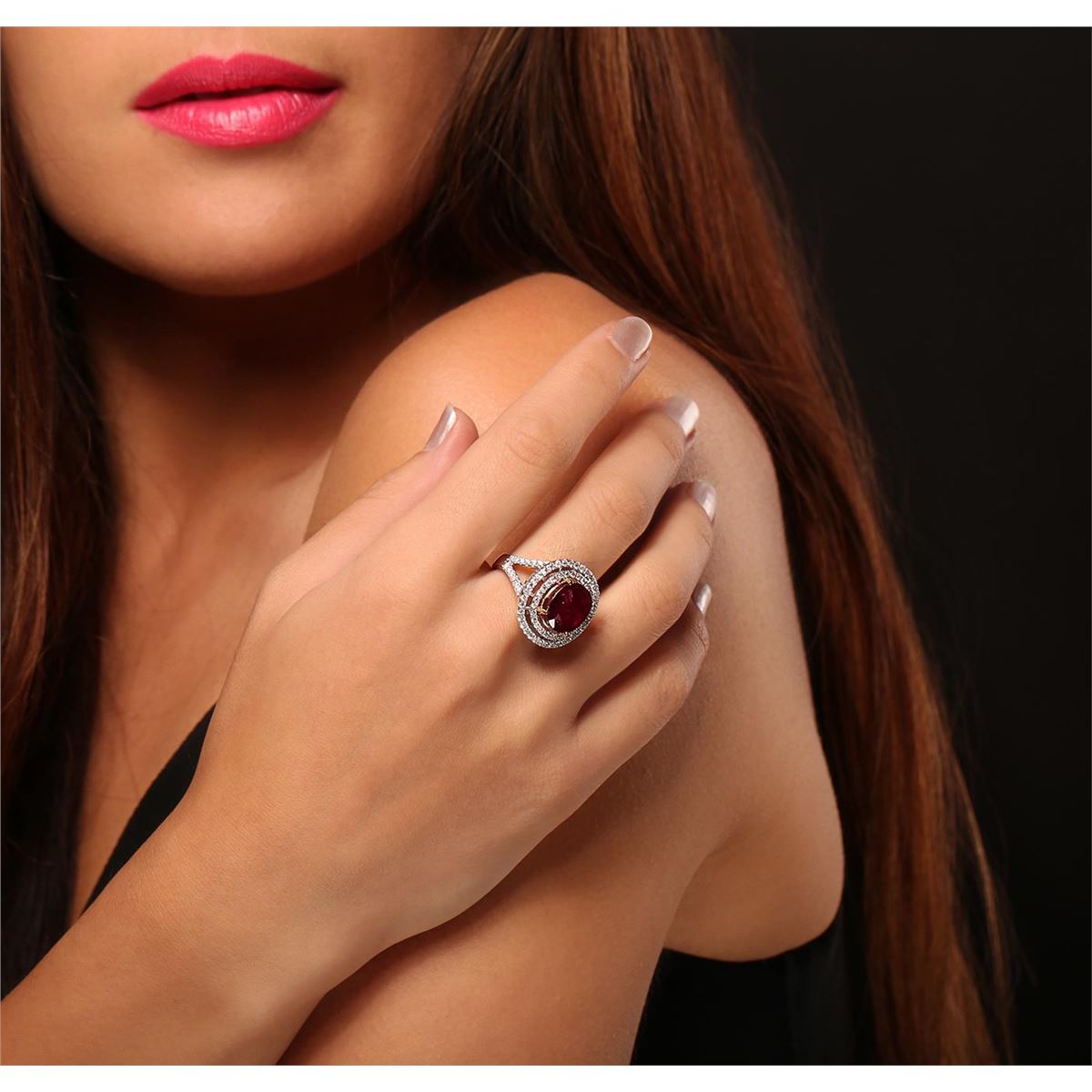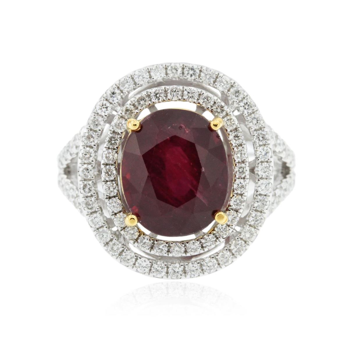 One electronically tested 14KT yellow and white gold Ladies combination cast & assembled ring with a bright polish finish. Condition is new. Identified with markings of "14K". Containing: Eighty-Eight prong set round brilliant cut diamonds, measuring 1.30 - 1.30 x 0.78mm (depth est.) approximate. Total Weight of 88 Stones = 1.01ct. Clarity: I-1 to I-3. Color: I - J, Cut is Good. One prong set oval modified brilliant cut natural ruby, measuring 11.40 x 9.20 x 6.20mm, exact weight 6.63ct., clarity is heavily included, type II, medium dark, moderately strong, strongly purplish red color, (GIA stpR 6/4), cut is good. Colored gemstones are presumed to have been subjected to commonly used color/clarity enhancement processes. Total Weight of Colored Stones 6.63ct. Total Weight of Diamonds 1.01ct. Total Weight of Ring 9.20 grams. GGL Appraised at $6,895.00.