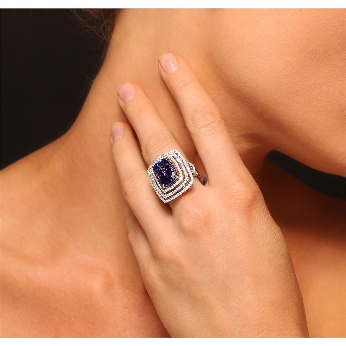 One electronically tested 14KT yellow and white gold Ladies combination cast & assembled ring with a bright polish finish. Condition is new. Identified with markings of "14K". Containing: One Hundred Eighty-Six prong set round brilliant cut diamonds, measuring 1.20 - 1.20 x 0.72mm (depth est.) approximate. Total Weight of 186 Stones = 1.73ct. Clarity: I-1 to I-2. Color: I - J, Cut is Good. One prong set rectangular cushion modified mixed cut natural tanzanite, measuring 14.00 x 10.00 x 6.50mm, approximate weight of 8.13ct., clarity is eye clean, type I, medium light, very slightly grayish, bluish violet color, (GIA bV 4/3), cut is very good. Colored gemstones are presumed to have been subjected to commonly used color/clarity enhancement processes. Total Weight of Colored Stones 8.13ct. Total Weight of Diamonds 1.73ct. Total Weight of Ring 8.50 grams. GGL Appraised at $12,885.00.