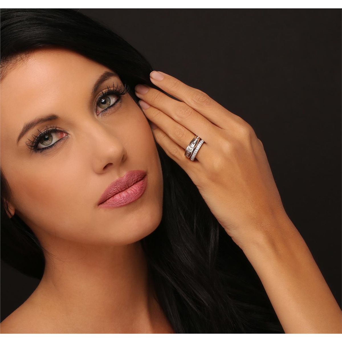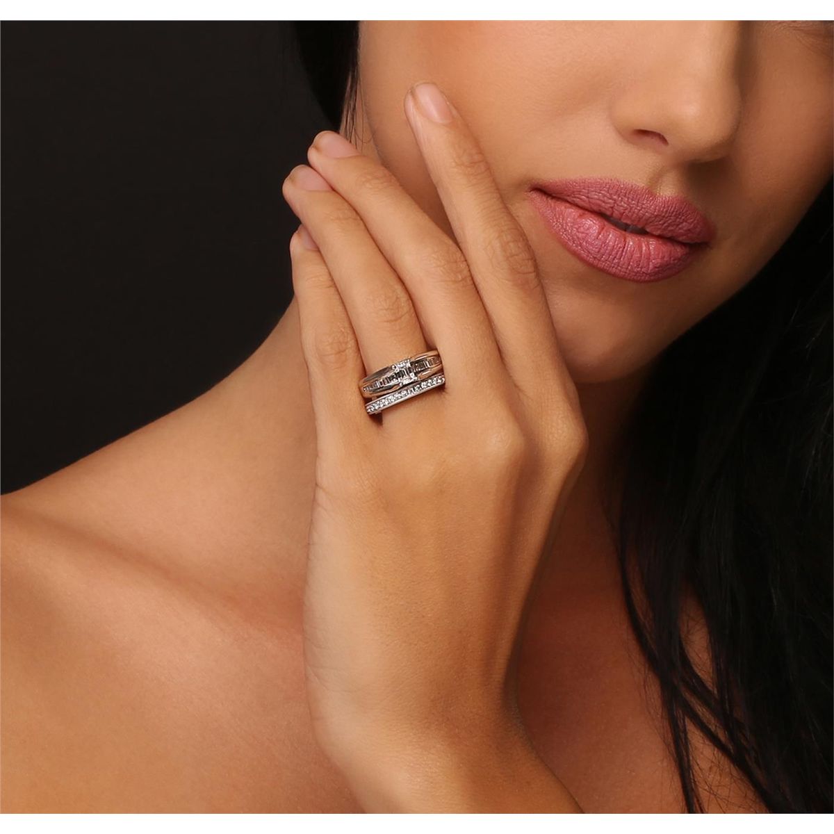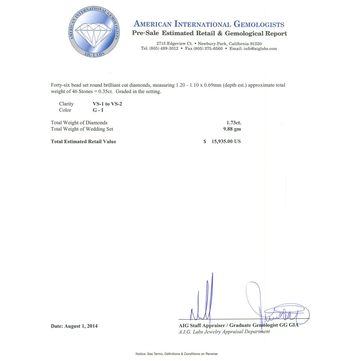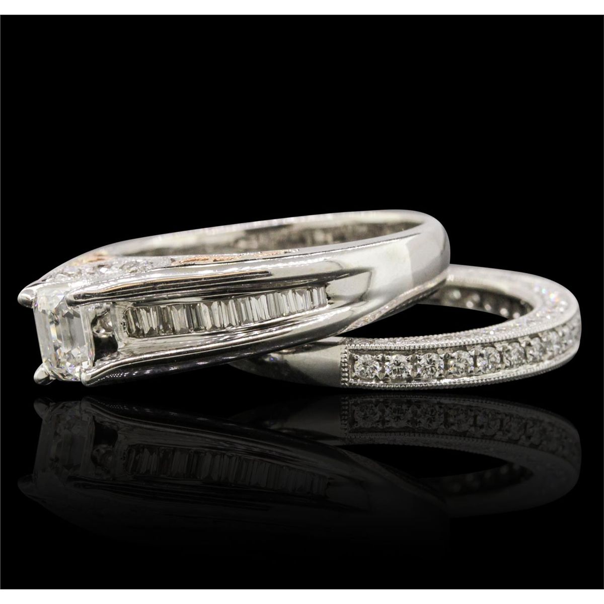 One electronically tested 14KT and 18KT white gold ladies cast & assembled diamond wedding set. Condition is good. The wedding set includes a diamond engagement ring and a diamond wedding band. The engagement ring features a diamond supported by a diamond set under gallery with rose gold accents and diamond set shoulders, completed by a three millimeter wide band. The set is completed by a diamond wedding band from Helzberg's Masterpiece Collection with a two millimeter wide band. Bright polish finish with milgrain detailing. Identified with markings of "585 18K". Containing: One prong set emerald shaped cut diamond, measuring 5.10 x 4.85 x 2.80mm (depth est.) approximate weight of 0.73ct. Graded in the setting. Clarity: VS-1. Color: H Depth 57.7%. Table 43.3%. Twenty-Six channel set baguette cut diamonds, measuring from 1.30 x 0.90 x 0.63mm (depth est.) to 1.80 x 1.00 x 0.70mm (depth est.) approximate. Total Weight of 26 Stones = 0.25ct. Graded in the setting. Clarity: VS-1 to VS-2. Color: H - I Ten bead set round brilliant cut diamonds, measuring 1.40 - 1.30 x 0.81mm (depth est.) approximate. Total Weight of 10 Stones = 0.10ct. Graded in the setting. Clarity: VS-2 to SI-1. Color: H - I Eighteen bead set round brilliant cut diamonds, measuring 1.50 - 1.40 x 0.87mm (depth est.) approximate. Total Weight of 18 Stones = 0.30ct. Graded in the setting. Clarity: VS-1 to VS-2. Color: G - I Forty-Six bead set round brilliant cut diamonds, measuring 1.20 - 1.10 x 0.69mm (depth est.) approximate. Total Weight of 46 Stones = 0.35ct. Graded in the setting. Clarity: VS-1 to VS-2. Color: G - I. Total Weight of Diamonds 1.73ct. Total Weight of Wedding Set 9.88 grams. AIG Appraised at $15,935.00.