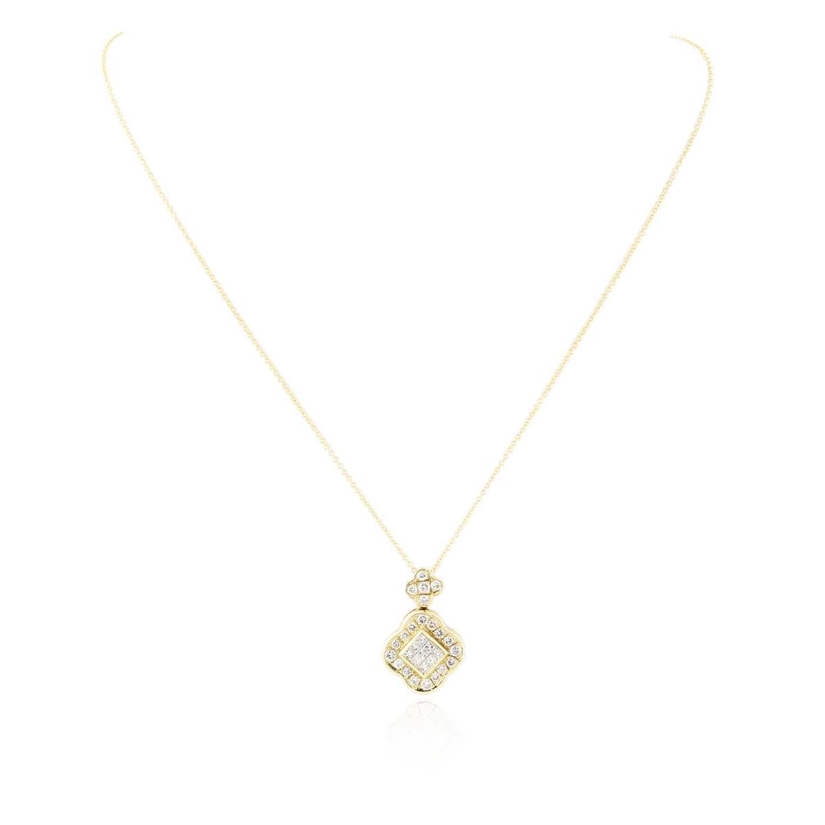 One electronically tested 14-18KT yellow gold ladies combination cast & assembled pendant & chain 16.0" long, light cable link with a spring ring clasp with a bright polish finish. Condition is new. Identified with markings of "14K-18K". Containing: Twenty-One prong set round brilliant cut diamonds, measuring 2.30 - 2.00 x 1.29mm (depth est.) approximate. Total Weight of 21 Stones = 0.70ct. Clarity: SI-2 to I-1. Color: G - H, Cut is Good. Nine invisible set princess cut diamonds, measuring 1.80 x 1.80 x 1.35mm (depth est.) approximate. Total Weight of 9 Stones = 0.32ct. Clarity: VS-2 to SI-1. Color: G - H, Cut is Good. All diamonds are graded in the mounting, unless otherwise stated. Total Weight of Diamonds 1.02ct. Total Weight of Pendant & Chain 6.60 grams. GGL Appraised at $5,220.00.