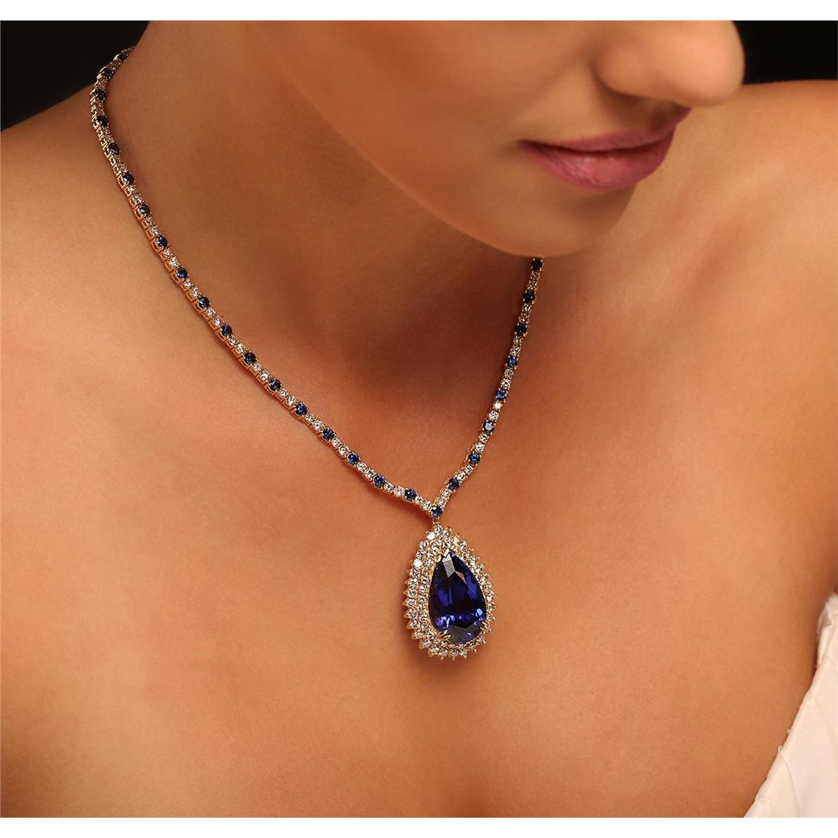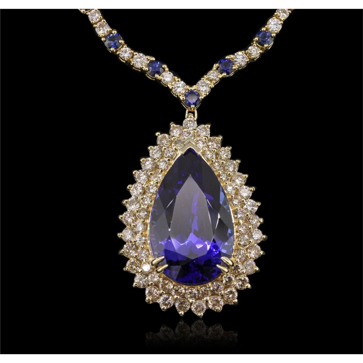 One electronically tested 14KT and 18KT yellow gold ladies cast & assembled tanzanite, sapphire, and diamond necklace with a bright polish finish. Condition is new, good workmanship. Seventeen inch length necklace features a 14KT yellow gold tanzanite and two tiered diamond bezel pendant supported by a flexible chevron style 18KT yellow gold sapphire and diamond ribbon, terminating in a concealed clasp with safety. Identified with markings of "14K 750". Containing: One prong set pear modified brilliant cut natural tanzanite, measuring 24.03 x 14.53 x 10.26mm, exact weight 23.14ct., clarity is eye clean, type I, medium dark, very slightly grayish, violetish blue color, (GIA vB 6/3), cut is good. Transmitting light with no distortion, transparent. GIA Colored Stone Grading Report attached. Graded loose prior to setting in the GIA Laboratory, Report #6157962282.Tanzanite is a very rare gemstone that is only found in the country of Tanzania. Originally discovered in 1967. Tiffany & Company, named the stone Tanzanite. It is found in the Usumburu Mountains that border the Umba Valley of northern Tanzania. Tanzanite occurs in gray, brown, violet, blue, reddish-purple, & green. The gem is interesting because of its exceptional pleochroism. Rotated in different directions a tanzanite will exhibit multiple changes of color. Tanzanite has a low tolerance to ultrasonic cleaning, and should not be cleaned using this method. Forty-six prong set round mixed cut natural blue sapphires, measuring 3.20 - 3.10 x 2.00 mm, approximate. Total Weight of 7.39ct., clarity is slightly included, type II, dark, moderately strong, blue color, (GIA B 7/4), cut is good. Transmitting light with a minimum of distortion, transparent. Naturally occurring internal & external characteristics are present, including partial color zoning. The color grade is an average for the group. Graded in the setting. One Hundred Fifty-Three prong set round brilliant cut diamonds, measuring 2.70 - 2.20 x 1.47mm (depth est.) approximate. Total Weight of 153 Stones = 8.03ct. Graded in the setting. Clarity: VS-2 to SI-2. Color: H - J. Total Weight of Colored Stones 30.53ct. Total Weight of Diamonds 8.03ct. Total Weight of Necklace 40.29 grams. AIGAppraised at $99,615.00.