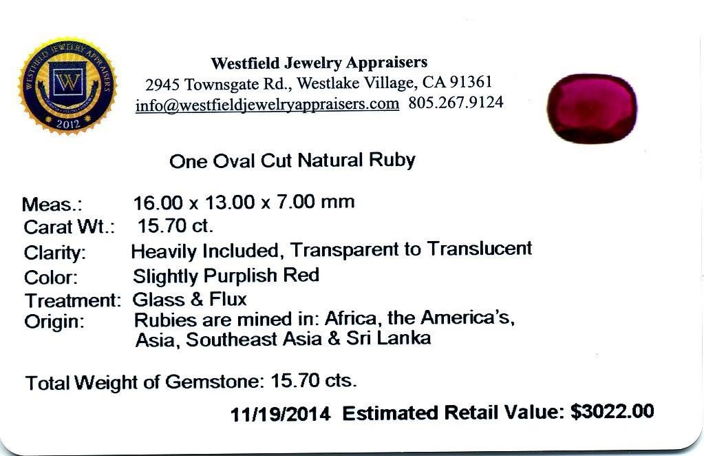 15.70ct. One Oval Cut Natural Ruby Westfield Appraised at $3,022.00.