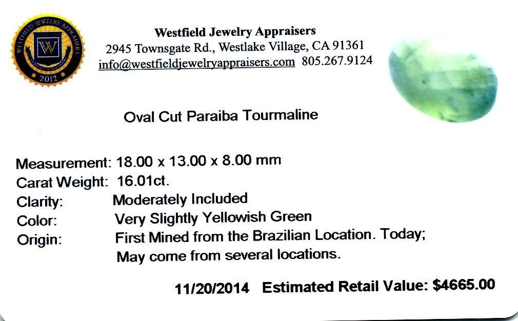 16.01ctw. Oval Cut Paraiba Tourmaline. Westfield Appraised at $4,665.00.