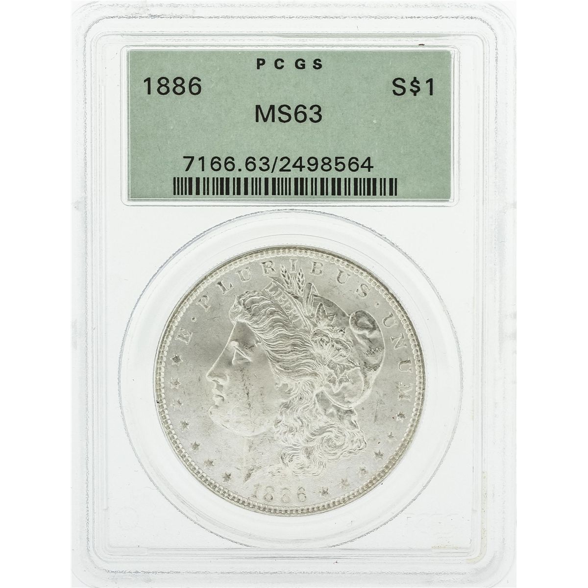 One 1886 PCGS MS63 Morgan Silver Dollar Coin.