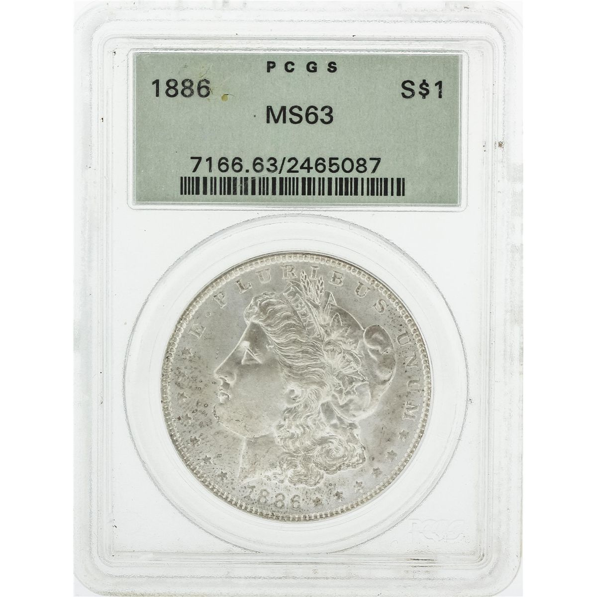 One 1886 PCGS MS63 Morgan Silver Dollar Coin.