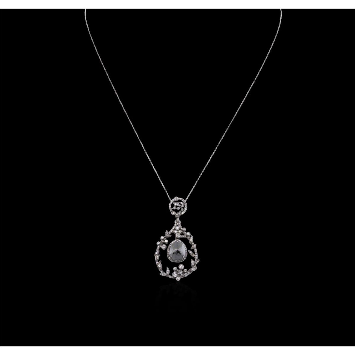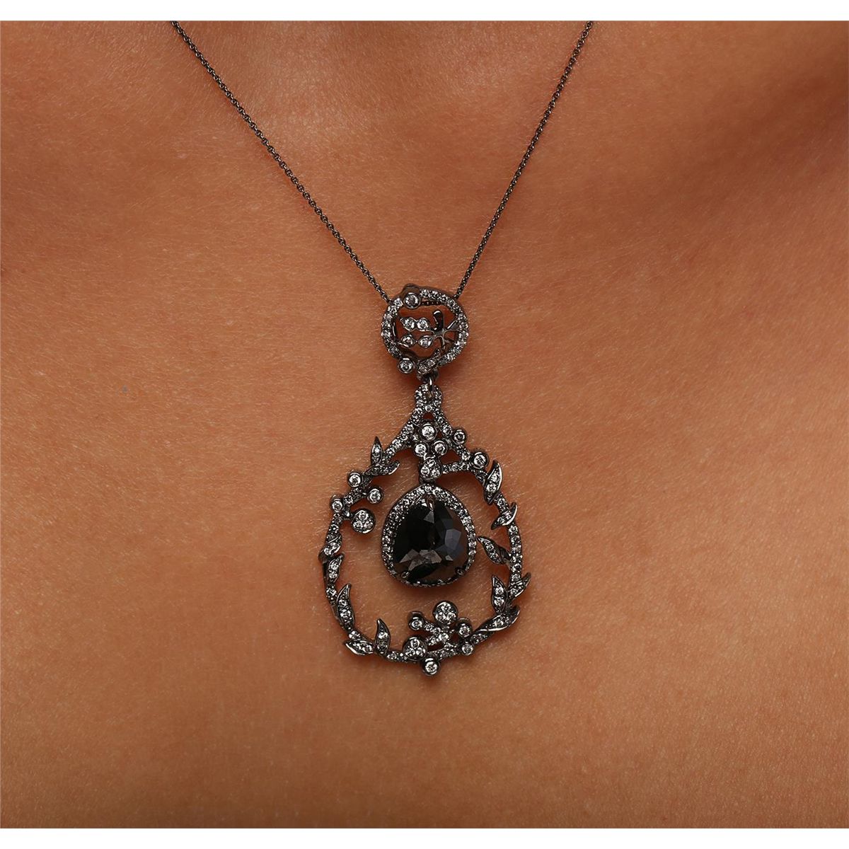 One black gold pendant with chain stamped 18k containing one natural pear rose cut fancy black diamond, enhanced for color, with a total weight of 1.20ct. The pendant also contains 155 round brilliant cut diamonds that are K-L color, SI3-I1 clarity with a
