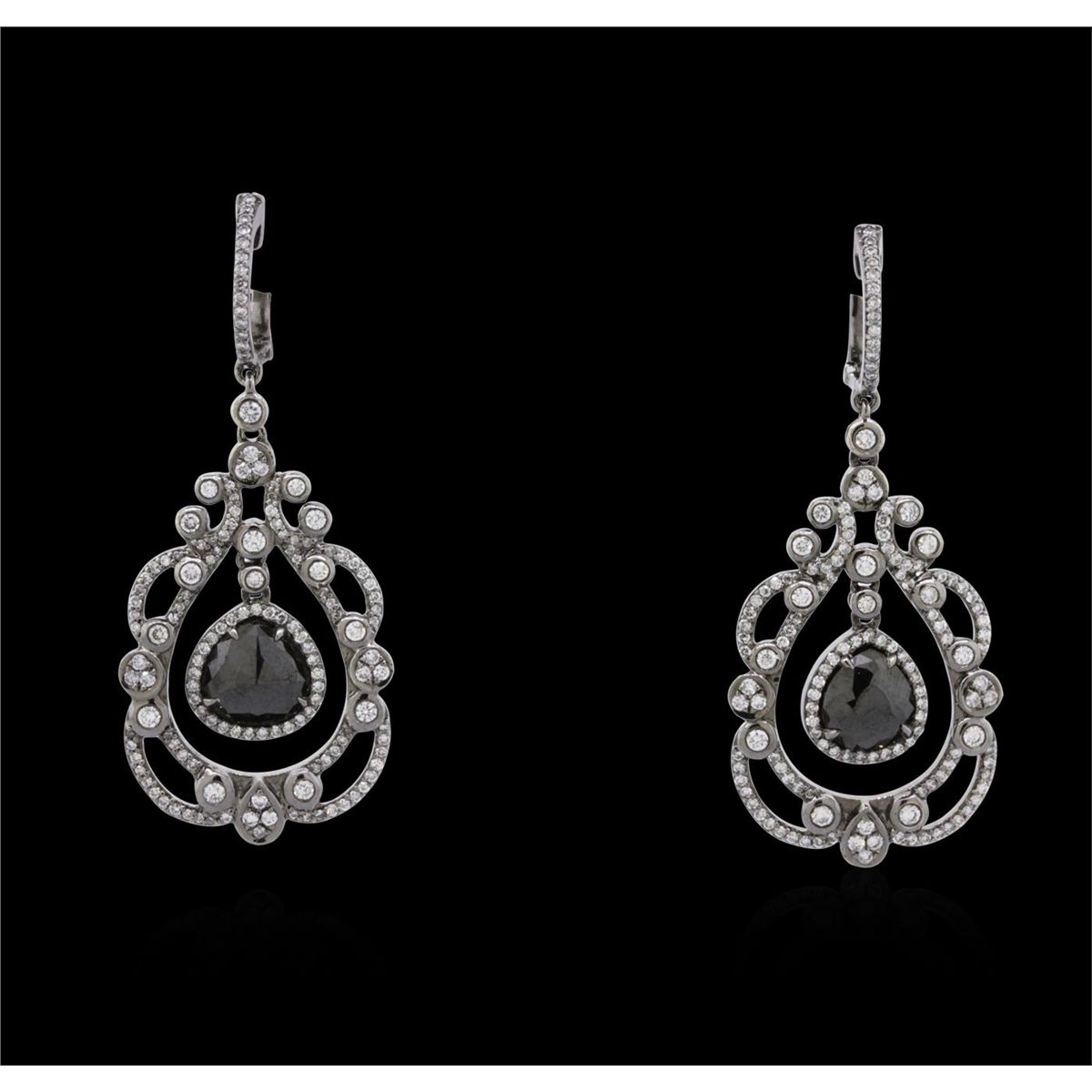 One pair of 18KT black gold earrings containing two natural pear rose cut fancy black diamonds, enhanced for color, with a total weight of 4.67ct. The earrings also contain diamonds graded F-G-H color, SI2-I1 clarity with a total weight of 1.53ct. Total w