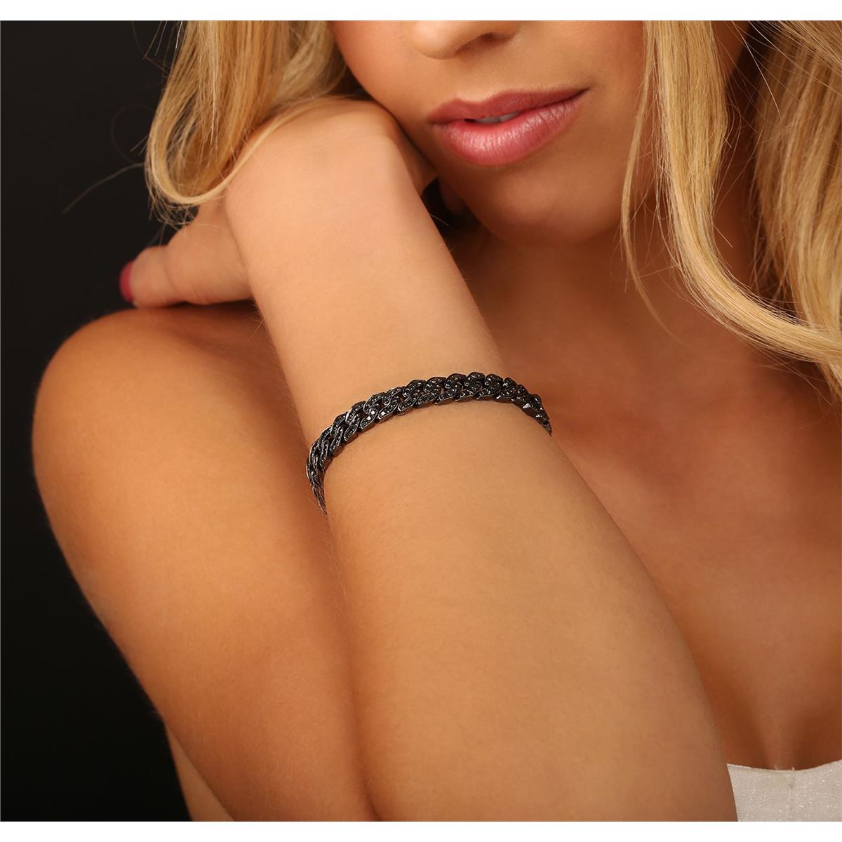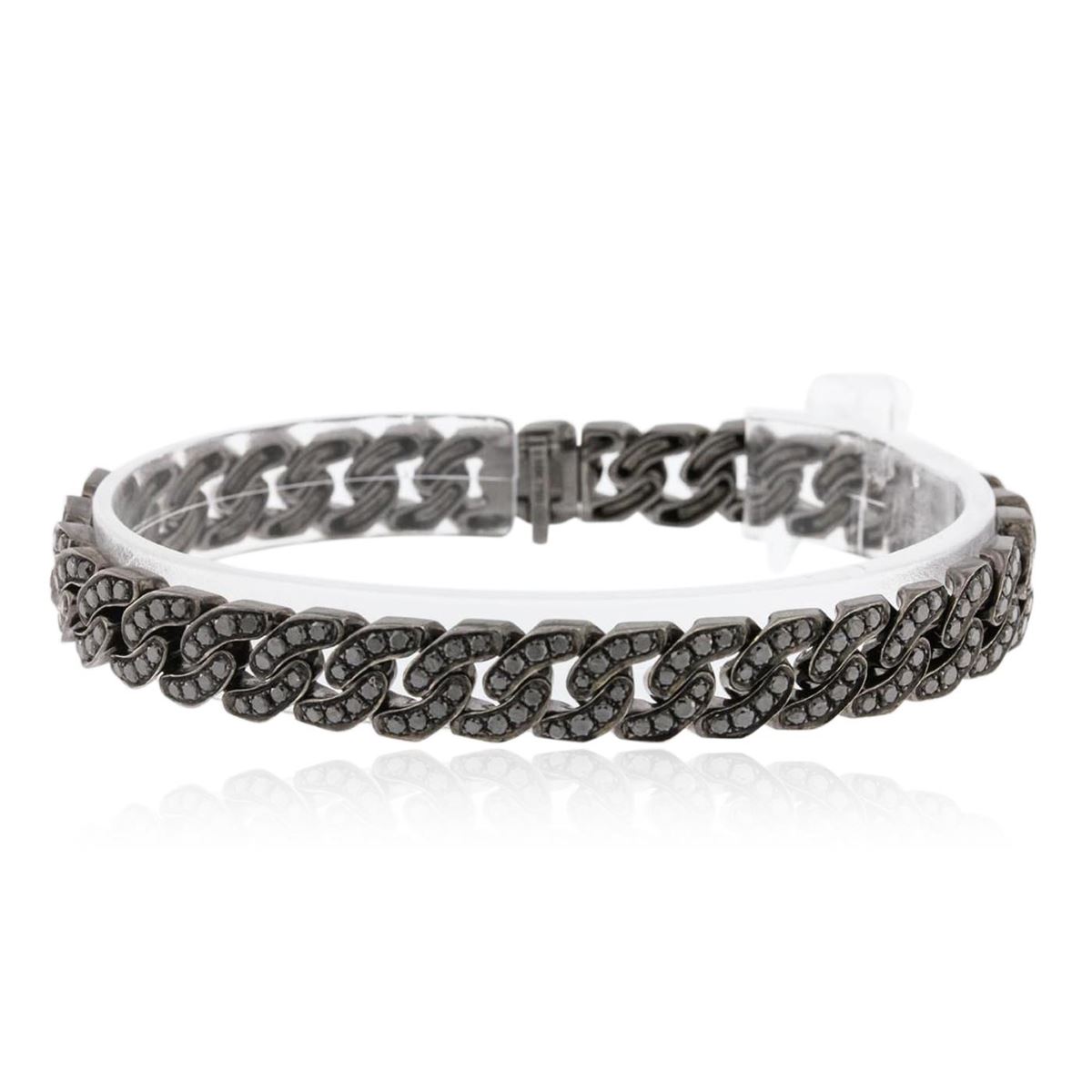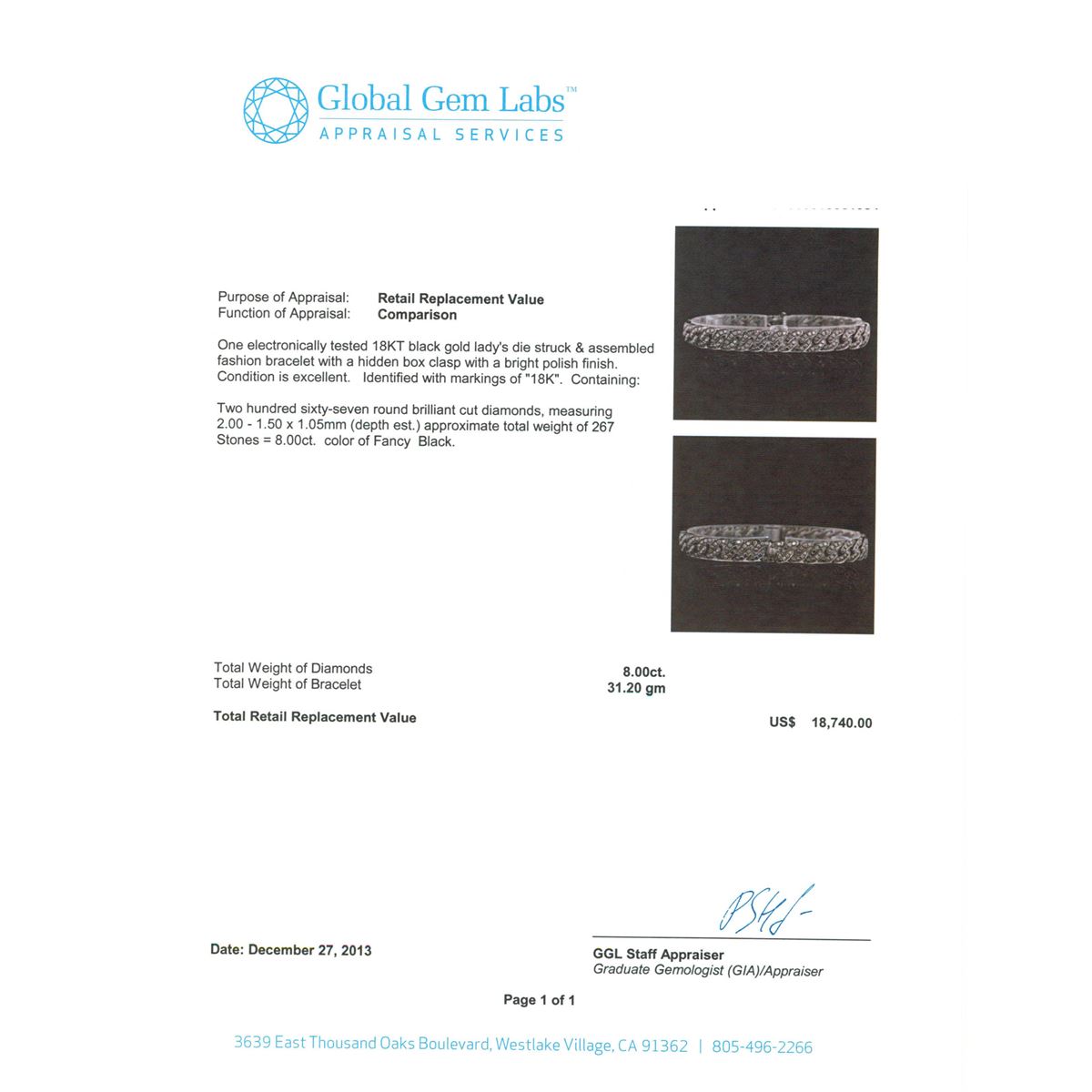 One electronically tested 18KT black gold Ladies die struck & assembled fashion bracelet with a hidden box clasp with a bright polish finish. Identified with markings of "18K". Condition is excellent. Containing: Two Hundred Sixty-Seven round brilliant cut diamonds, measuring 2.00 - 1.50 x 1.05mm (depth est.) approximate total weight of 267 Stones = 8.00ct. Total Weight of Diamonds 8.00ct. Total Weight of Bracelet 31.20gm. GGL Appraised at $18,740.00.