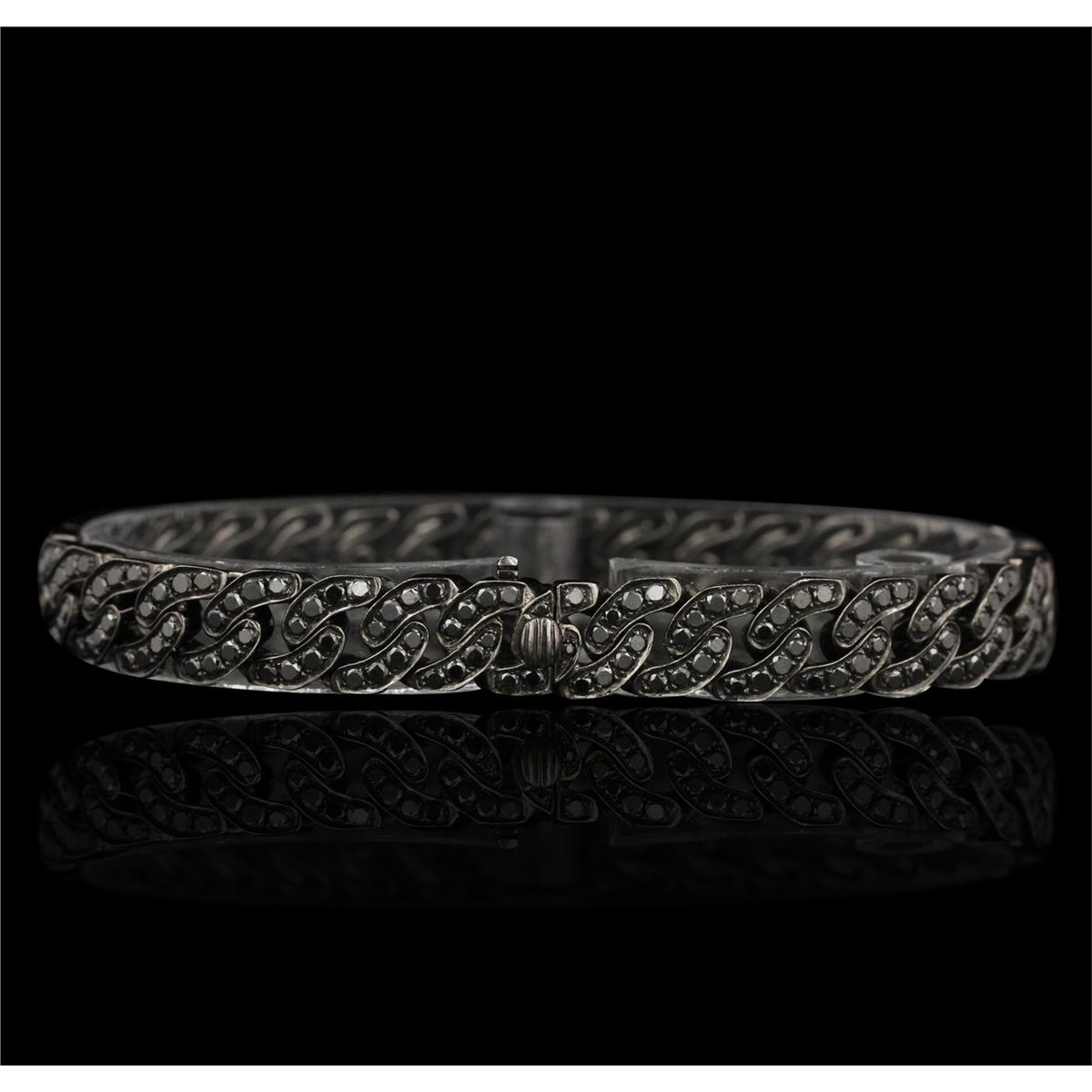 One electronically tested 18KT black gold Ladies die struck & assembled fashion bracelet with a hidden box clasp with a bright polish finish. Identified with markings of "18K". Condition is excellent. Containing: Two Hundred Sixty-Seven round brilliant cut diamonds, measuring 2.00 - 1.50 x 1.05mm (depth est.) approximate total weight of 267 Stones = 8.00ct. Total Weight of Diamonds 8.00ct. Total Weight of Bracelet 31.20gm. GGL Appraised at $18,740.00.