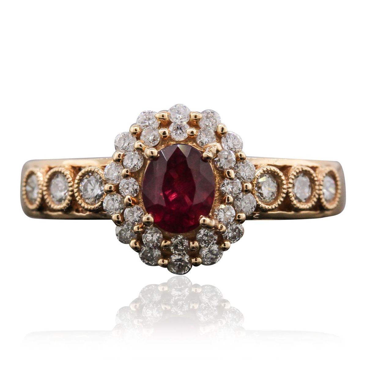 One ring featuring: 18KT Rose Gold with a total weight of 3.80 grams, (1) ruby with a total weight of 0.60ct, and (32) diamonds with a total weight of 0.49ctw.