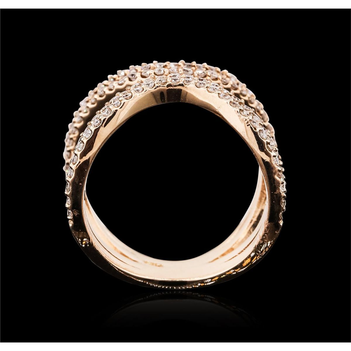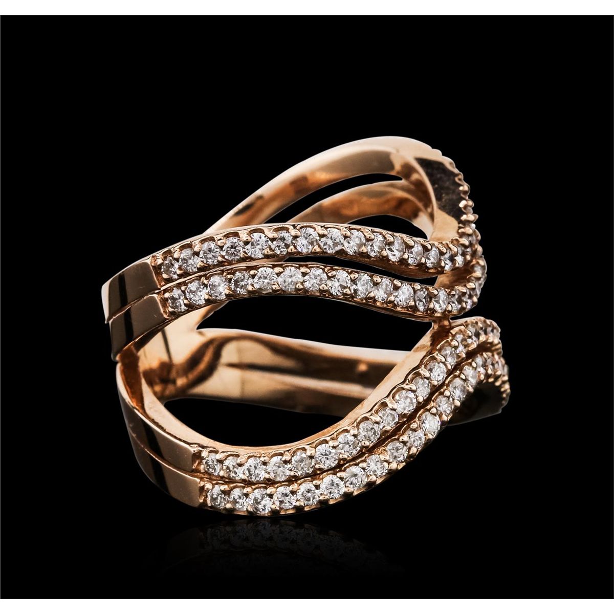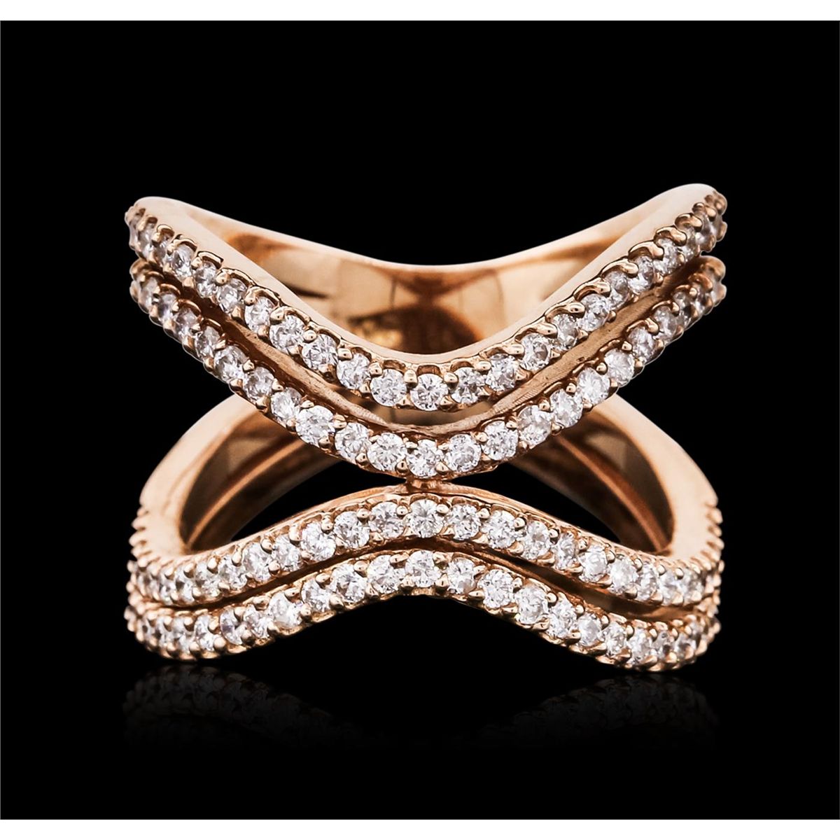 One electronically tested 18KT rose gold ladies combination cast & assembled diamond ring with a bright polish finish. Identified with markings of "K18". Condition is new. Containing: One Hundred Twelve prong set round brilliant cut diamonds, measuring 1.30 - 1.30 x 0.78mm (depth est.) approximate total weight of 112 Stones = 0.90ct. Clarity: I-1 to I-2. Color: J - K, Cut is Good. All diamonds are graded in the mounting, unless otherwise stated. Total Weight of Diamonds 0.90ct. Total Weight of Ring 7.90 grams. GGL Appraised at $4,520.00.