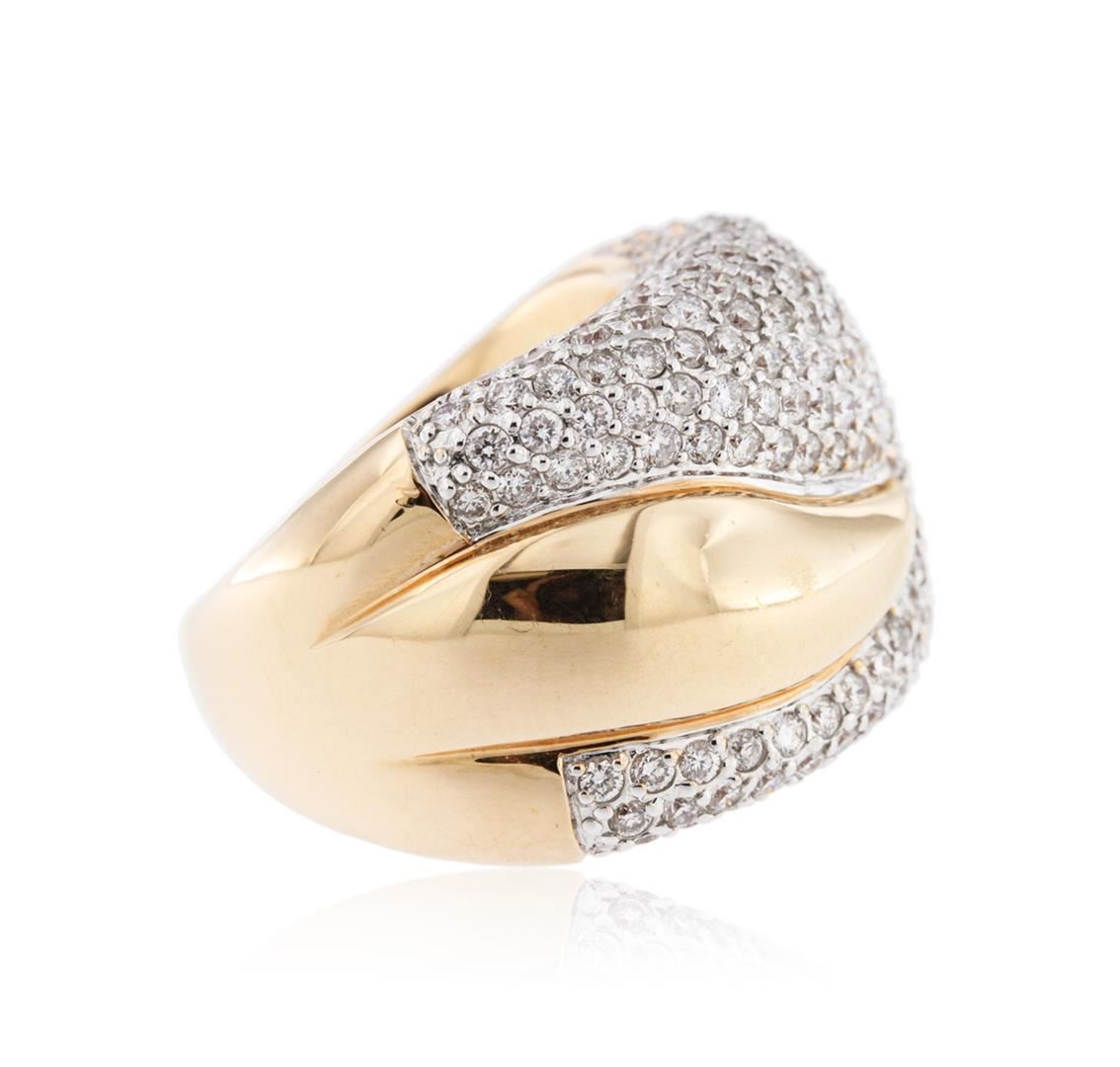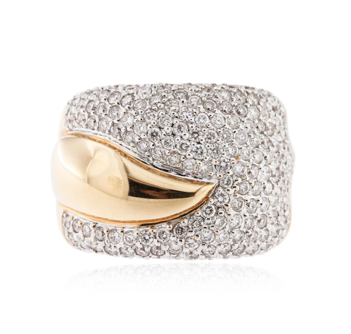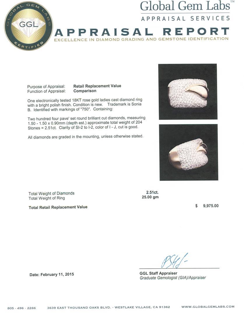 One electronically tested 18KT rose gold ladies cast diamond ring with a bright polish finish. Trademark is Sonia B. Identified with markings of "750". Condition is new. Containing: Two Hundred Four pave' set round brilliant cut diamonds, measuring 1.50 - 1.50 x 0.90mm (depth est.) approximate total weight of 204 Stones = 2.51ct. Clarity: SI-2 to I-2. Color: I - J, Cut is Good. All diamonds are graded in the mounting, unless otherwise stated. Total Weight of Diamonds 2.51ct. Total Weight of Ring 25.00 grams. GGL Appraised at $9,975.00.