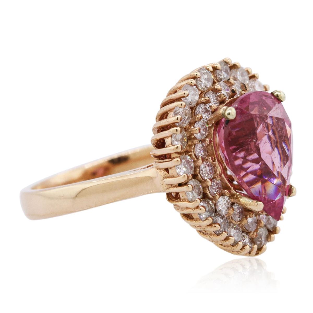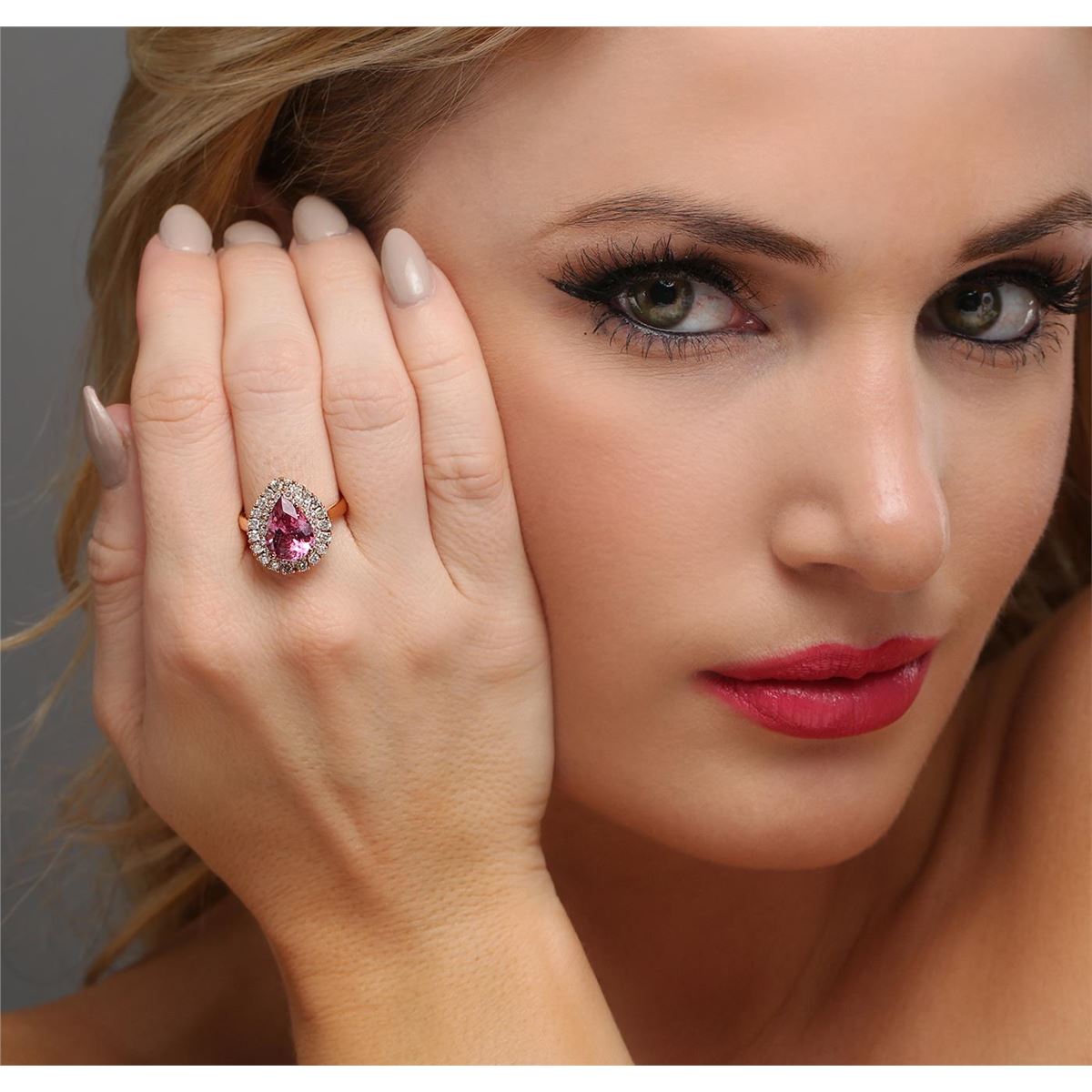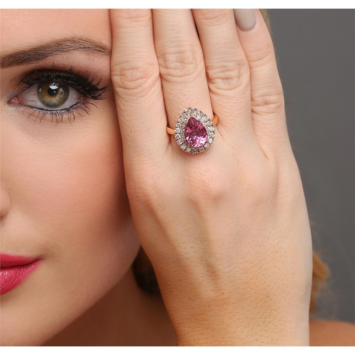 One electronically tested 18KT rose gold ladies cast pink spinel and diamond ring with a bright polish finish. The featured pink spinel is set within a tiered diamond bezel, completed by a two and one-half millimeter wide band. Identified with markings of "18K". Condition is new, good workmanship. Containing: One prong set pear mixed cut natural pink spinel, measuring 11.55 x 8.50 x 6.15mm, 6%. bulge factor, approximate weight of 4.61ct., clarity is slightly included, medium dark, very slightly grayish, pink color, (GIA Pk 6/3), cut is good. Transmitting light with a minimum of distortion, transparent. Naturally occurring internal & external characteristics are present. Refractive index testing results of 1.72. This is a conclusive result for spinel. Graded in the setting. Twenty prong set round brilliant cut diamonds, measuring 2.10 - 2.00 x 1.23mm (depth est.) approximate total weight of 20 Stones = 0.73ct. Graded in the setting. Clarity: I-1 to I-2. Color: H - J Nineteen prong set round brilliant cut diamonds, measuring 1.80 - 1.70 x 1.05mm (depth est.) approximate total weight of 19 Stones = 0.47ct. Graded in the setting. Clarity: SI-2 to I-2. Color: H - J. Total Weight of Colored Stones 4.61ct. Total Weight of Diamonds 1.20ct. Total Weight of Ring 6.92 grams. AIG Appraised at $9,945.00.