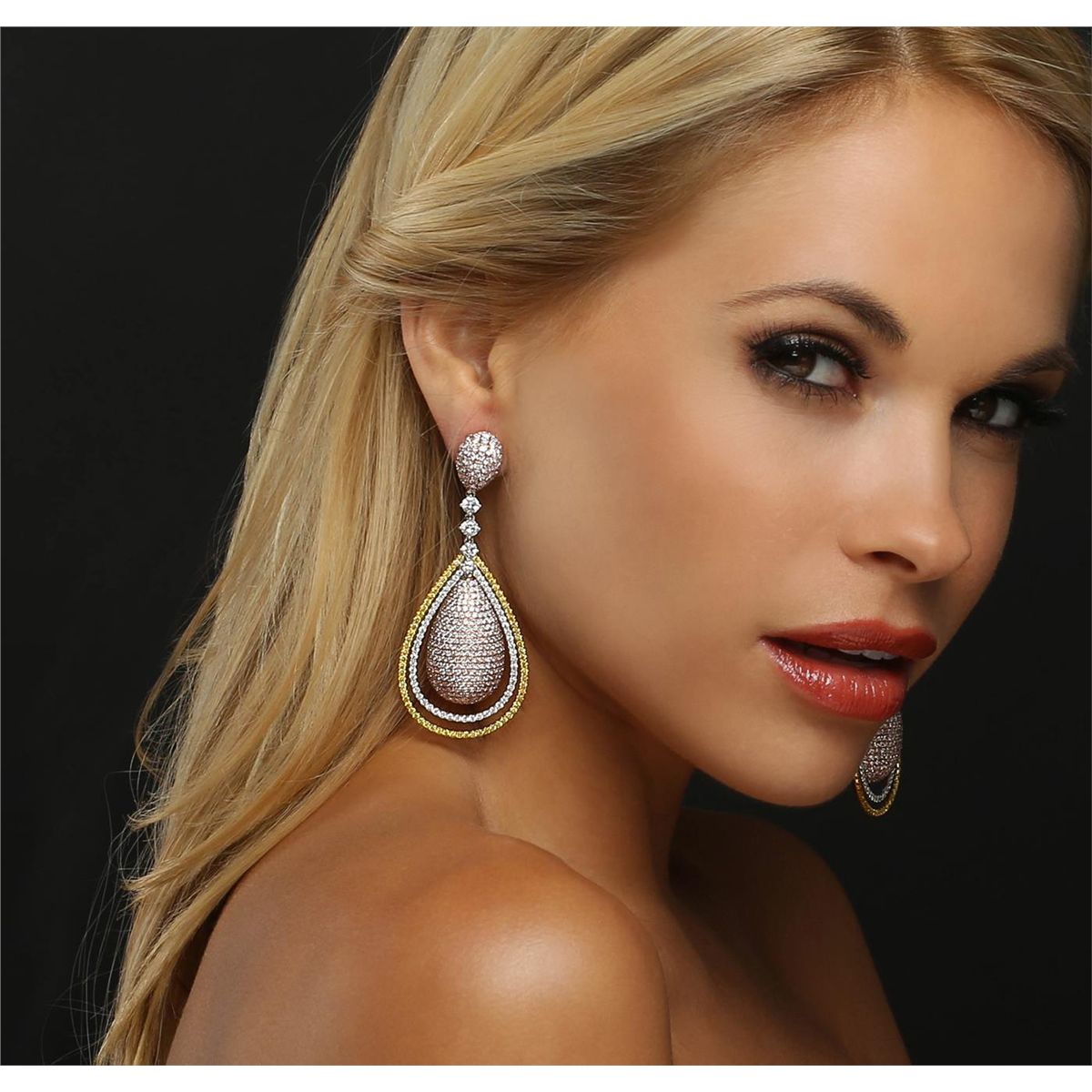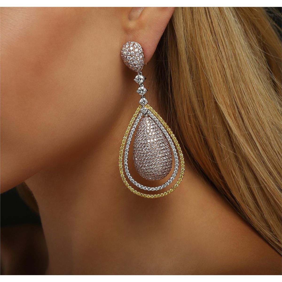 One pair electronically tested 18KT yellow, white & rose gold ladies custom cast & hand crafted diamond dangle earrings with French backs. Each earring features a free moving central drop of pink diamonds, set within an inner white diamond ribbon and an outer yellow diamond ribbon, supported by a four diamond transition, and a pink diamond set bail. The overall length is three inches. Trademark is AKMS. Identified with markings of "18K". Condition is good. Containing: Six Hundred Ninety-Six round brilliant cut diamonds, measuring 2.20 - 1.50 x 1.11mm (depth est.) approximate total weight of 696 Stones = 11.78ct. Graded in the setting. Clarity: SI-1 to I-1 One Hundred Thirty-Four prong set round brilliant cut diamonds, measuring 1.65 - 1.50 x 0.95mm (depth est.) approximate total weight of 134 Stones = 2.51ct. This color of diamond is commonly irradiated to improve or change the color. Evidence that may confirm irradiation is typically lacking. Graded in the setting. Clarity: SI-1 to I-1 One Hundred Sixteen prong set round brilliant cut diamonds, measuring 4.20 x 2.52mm (depth est.) approximate total weight of 116 Stones = 3.66ct. Graded in the setting. Clarity: SI-1 to I-1. Color: G - H. Total Weight of Diamonds 17.95ct. Total Weight of Earrings 44.60 grams. AIG Appraised at $62,000.00.