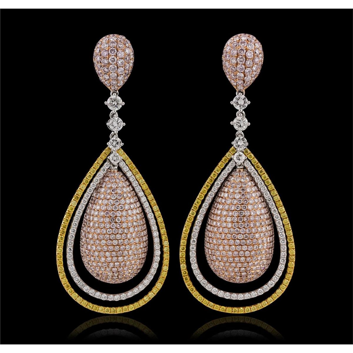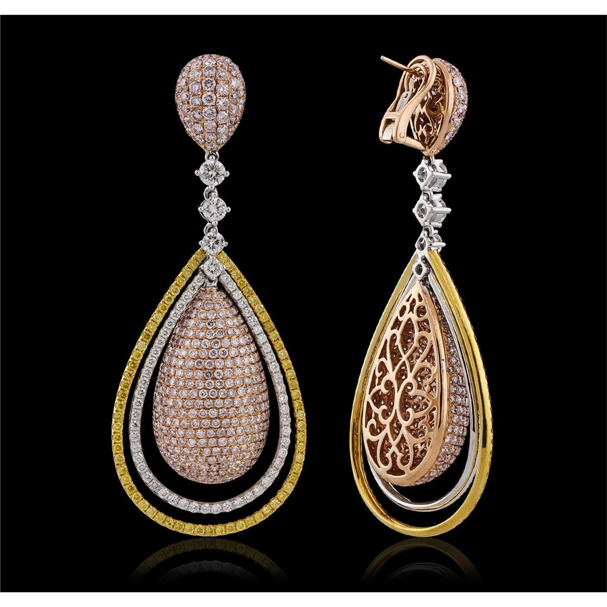 One pair electronically tested 18KT yellow, white & rose gold ladies custom cast & hand crafted diamond dangle earrings with French backs. Each earring features a free moving central drop of pink diamonds, set within an inner white diamond ribbon and an outer yellow diamond ribbon, supported by a four diamond transition, and a pink diamond set bail. The overall length is three inches. Trademark is AKMS. Identified with markings of "18K". Condition is good. Containing: Six Hundred Ninety-Six round brilliant cut diamonds, measuring 2.20 - 1.50 x 1.11mm (depth est.) approximate total weight of 696 Stones = 11.78ct. Graded in the setting. Clarity: SI-1 to I-1 One Hundred Thirty-Four prong set round brilliant cut diamonds, measuring 1.65 - 1.50 x 0.95mm (depth est.) approximate total weight of 134 Stones = 2.51ct. This color of diamond is commonly irradiated to improve or change the color. Evidence that may confirm irradiation is typically lacking. Graded in the setting. Clarity: SI-1 to I-1 One Hundred Sixteen prong set round brilliant cut diamonds, measuring 4.20 x 2.52mm (depth est.) approximate total weight of 116 Stones = 3.66ct. Graded in the setting. Clarity: SI-1 to I-1. Color: G - H. Total Weight of Diamonds 17.95ct. Total Weight of Earrings 44.60 grams. AIG Appraised at $62,000.00.