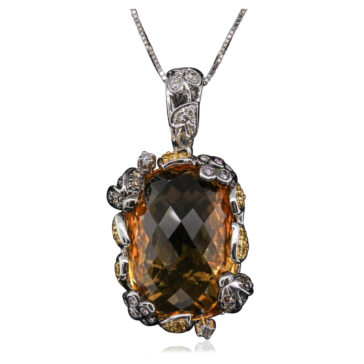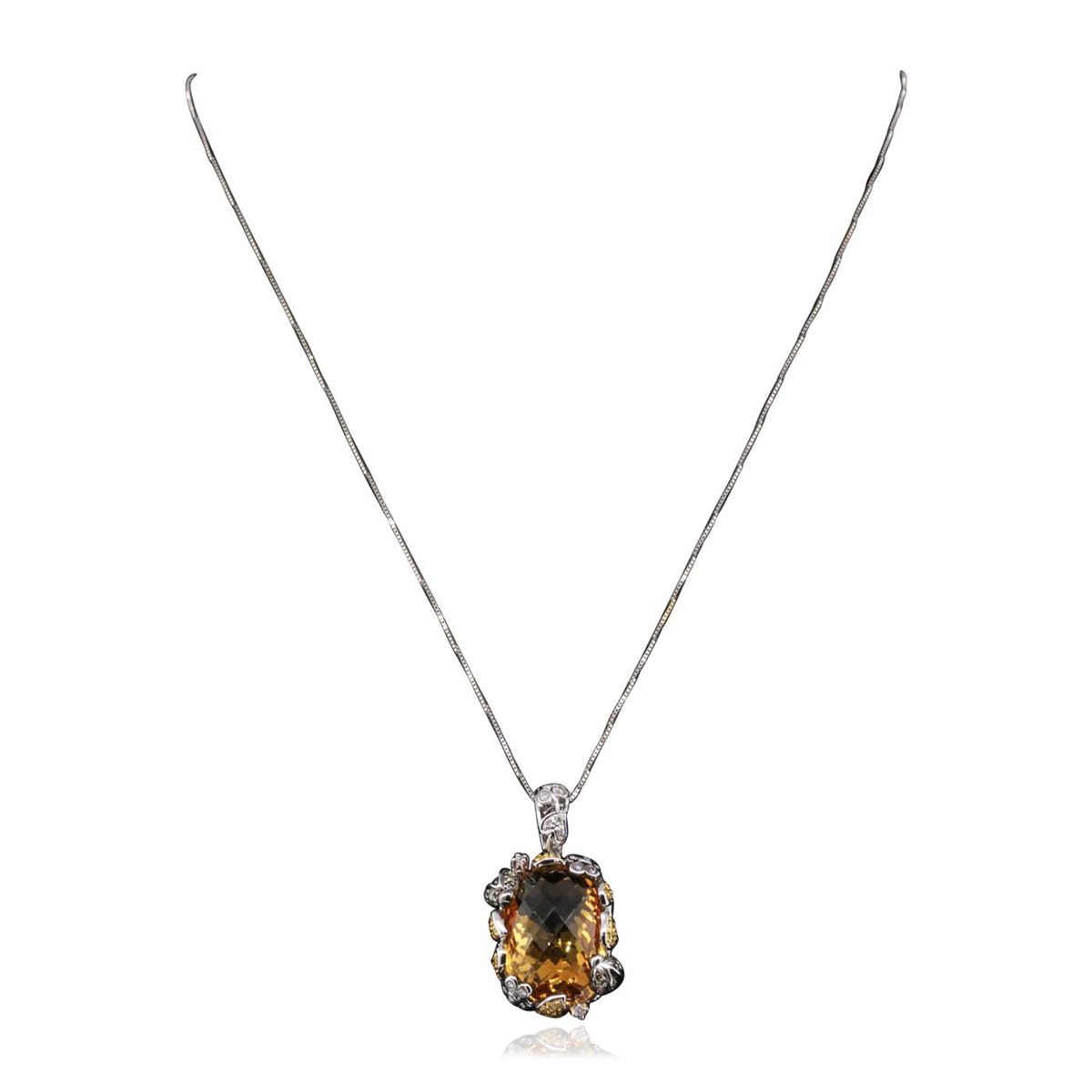 One electronically tested 18KT white, yellow and black gold ladies combination cast & assembled pendant & chain 18.0" long, thin box link with a barrel clasp with a bright polish finish. Identified with markings of "750". Condition is new. Containing: One prong set fantasy cut cut natural citrine quartz, measuring 23.00 x 15.00 x 10.08mm, approximate weight of 40.00ct., clarity is eye clean, type I, medium light, moderately strong, orangy yellow color, (GIA oY 4/4), cut is good. Nineteen prong set round brilliant cut diamonds, measuring 1.10 - 1.10 x 0.66mm (depth est.) approximate total Weight of 19 Stones = 0.09ct. Clarity: I-1 to I-2, color of Fancy Yellowish Green, Cut is Good. Eighteen prong set round brilliant cut diamonds, measuring 1.10 - 1.10 x 0.66mm (depth est.) approximate total weight of 18 Stones = 0.09ct. . Clarity: I-1 to I-2, color of Fancy Yellow, cut is Good. Ten prong set round brilliant cut diamonds, measuring 1.10 - 1.10 x 0.66mm (depth est.) approximate total Weight of 10 Stones = 0.05ct. color of Fancy Black, cut is Good. Twenty prong set round brilliant cut diamonds, measuring 1.10 - 1.10 x 0.66mm (depth est.) approximate total weight of 20 Stones = 0.10ct. . Clarity: I-1 to I-2. Color: I - J, Cut is Good. Colored gemstones are presumed to have been subjected to commonly used enhancement processes. All diamonds and colored gemstones are graded in the mounting, unless otherwise stated.. Total Weight of Colored Stones 40.00ct.. Total Weight of Diamonds 0.32ct.. Total Weight of Pendant & Chain 11.70 grams. GGL Appraised at $6,145.00.