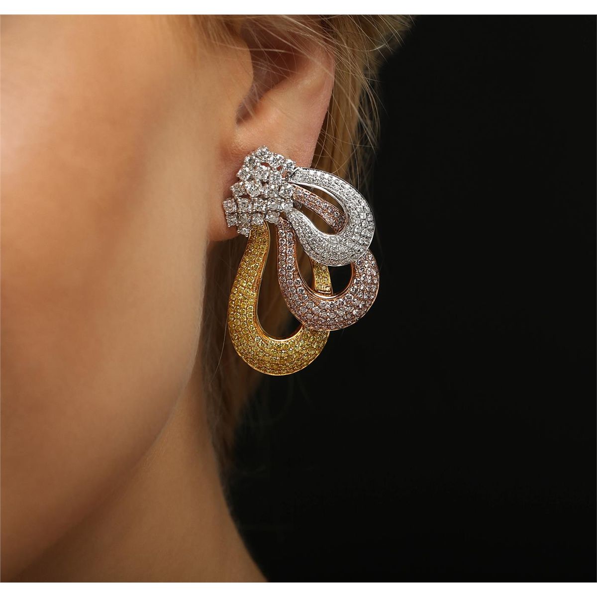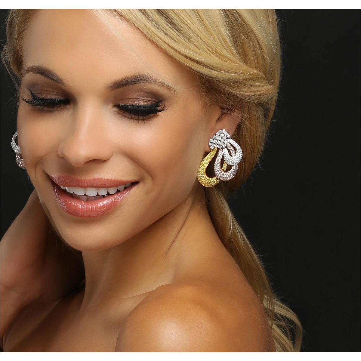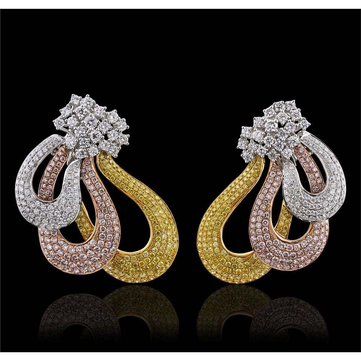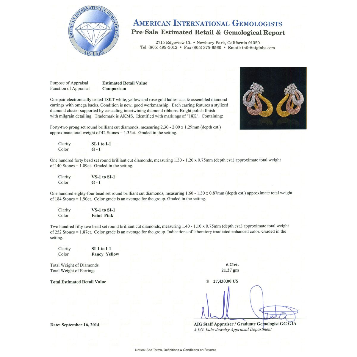 One pair electronically tested 18KT white, yellow and rose gold ladies cast & assembled diamond earrings with omega backs. Each earring features a stylized diamond cluster supported by cascading intertwining diamond ribbons. Bright polish finish with milgrain detailing. Trademark is AKMS. Identified with markings of "18K". Condition is new, good workmanship. Containing: Forty-Two prong set round brilliant cut diamonds, measuring 2.30 - 2.00 x 1.29mm (depth est.) approximate total weight of 42 Stones = 1.35ct. Graded in the setting. Clarity: SI-1 to I-1. Color: G - I One Hundred Forty bead set round brilliant cut diamonds, measuring 1.30 - 1.20 x 0.75mm (depth est.) approximate total weight of 140 Stones = 1.09ct. Graded in the setting. Clarity: VS-1 to SI-1. Color: G - I One Hundred Eighty-Four bead set round brilliant cut diamonds, measuring 1.60 - 1.30 x 0.87mm (depth est.) approximate total weight of 184 Stones = 1.90ct. Color grade is an average for the group. Graded in the setting. Clarity: VS-1 to SI-1 Two Hundred Fifty-Two bead set round brilliant cut diamonds, measuring 1.40 - 1.10 x 0.75mm (depth est.) approximate total weight of 252 Stones = 1.87ct. Color grade is an average for the group. Indications of laboratory irradiated enhanced color. Graded in the setting. Clarity: SI-1 to I-1. Total Weight of Diamonds 6.21ct. Total Weight of Earrings 21.27 grams. AIG Appraised at $27,430.00.