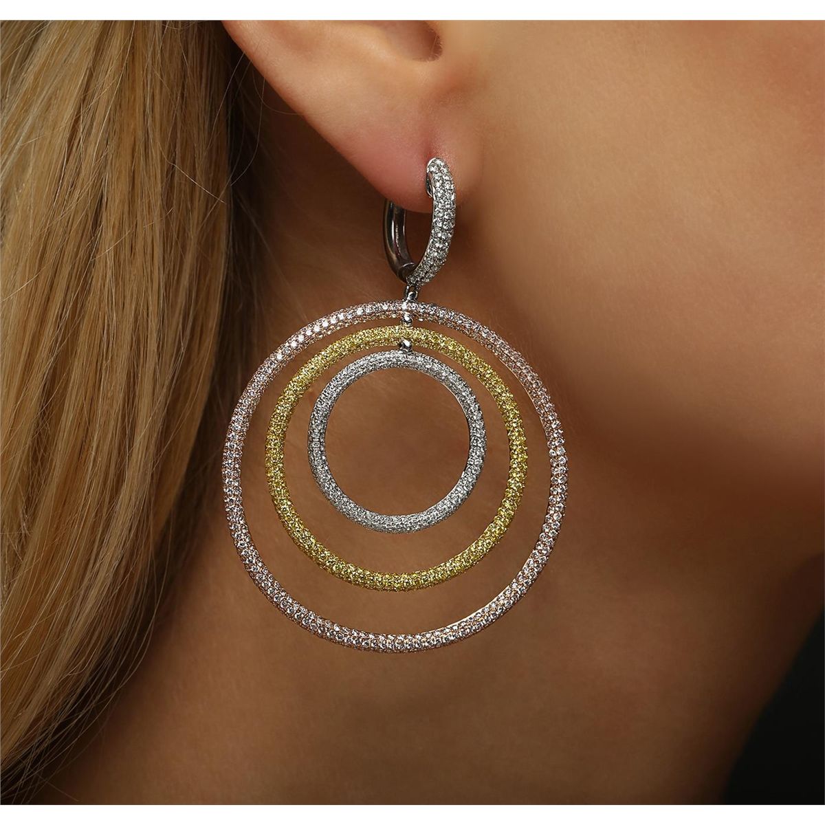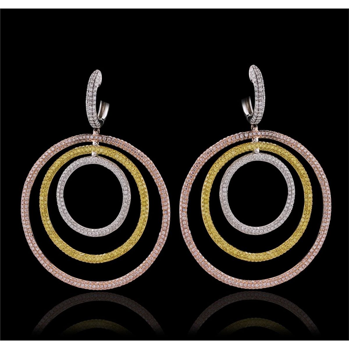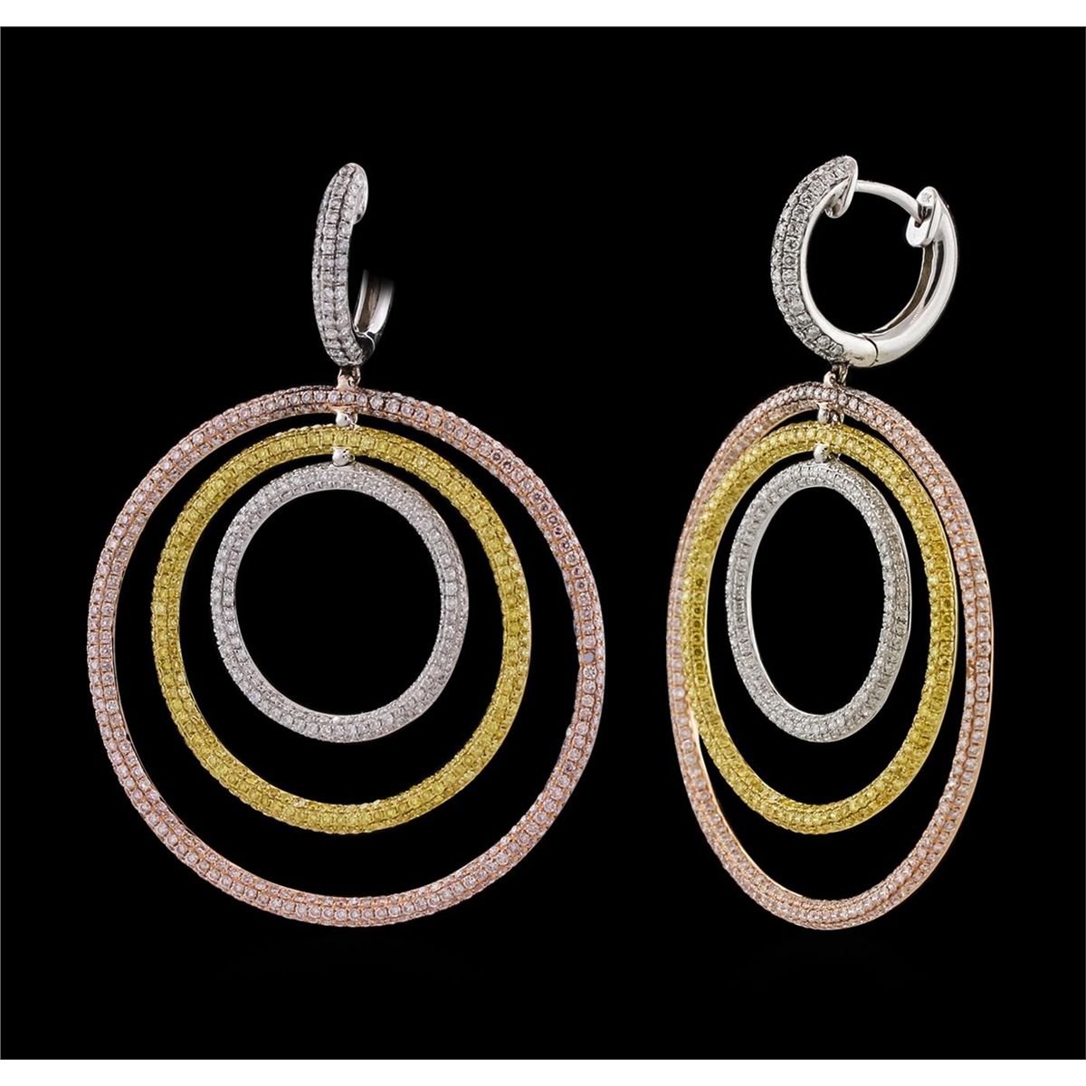One pair electronically tested 18KT yellow, white & rose gold ladies custom cast & assembled diamond dangle earrings with hinged, snap locking posts. The Inner disk is set with white diamonds. The middle disk set with yellow diamonds. And the outer disk set with pink diamonds. The overall diameter is one and three quarter inch in diameter. Condition is good. Containing: Four Hundred Thirty prong set round brilliant cut diamonds, measuring 1.20 - 0.85 x 0.63mm (depth est.) approximate total weight of 430 Stones = 1.94ct. Graded in the setting. Clarity: SI-1 to SI-2. Color: F - H Five Hundred Ten prong set round brilliant cut diamonds, measuring 1.30 - 1.00 x 0.69mm (depth est.) approximate total weight of 510 Stones = 3.14ct. This color of diamond is commonly irradiated to improve or change the color. Evidence that may confirm irradiation is typically lacking. Graded in the setting. Clarity: VS-2 to SI-1 Six Hundred Ninety prong set round brilliant cut diamonds, measuring 1.30 - 1.00 x 0.69mm (depth est.) approximate total weight of 690 Stones = 4.03ct. Faint Pink to very light pink. Graded in the setting. Clarity: VS-1 to VS-2. Total Weight of Diamonds 9.11ct. Total Weight of Earrings 19.40 grams. AIG Appraised at $44,000.00.