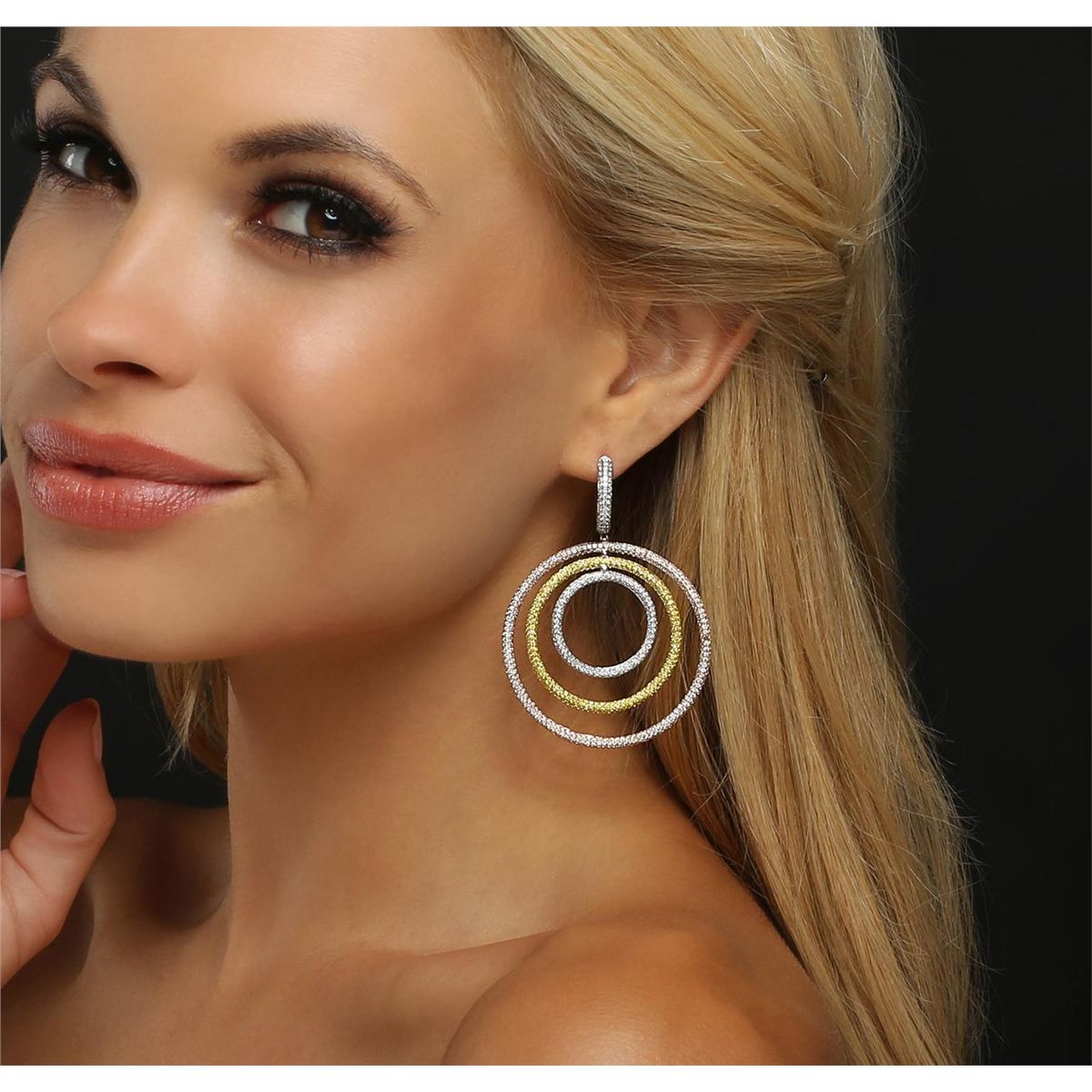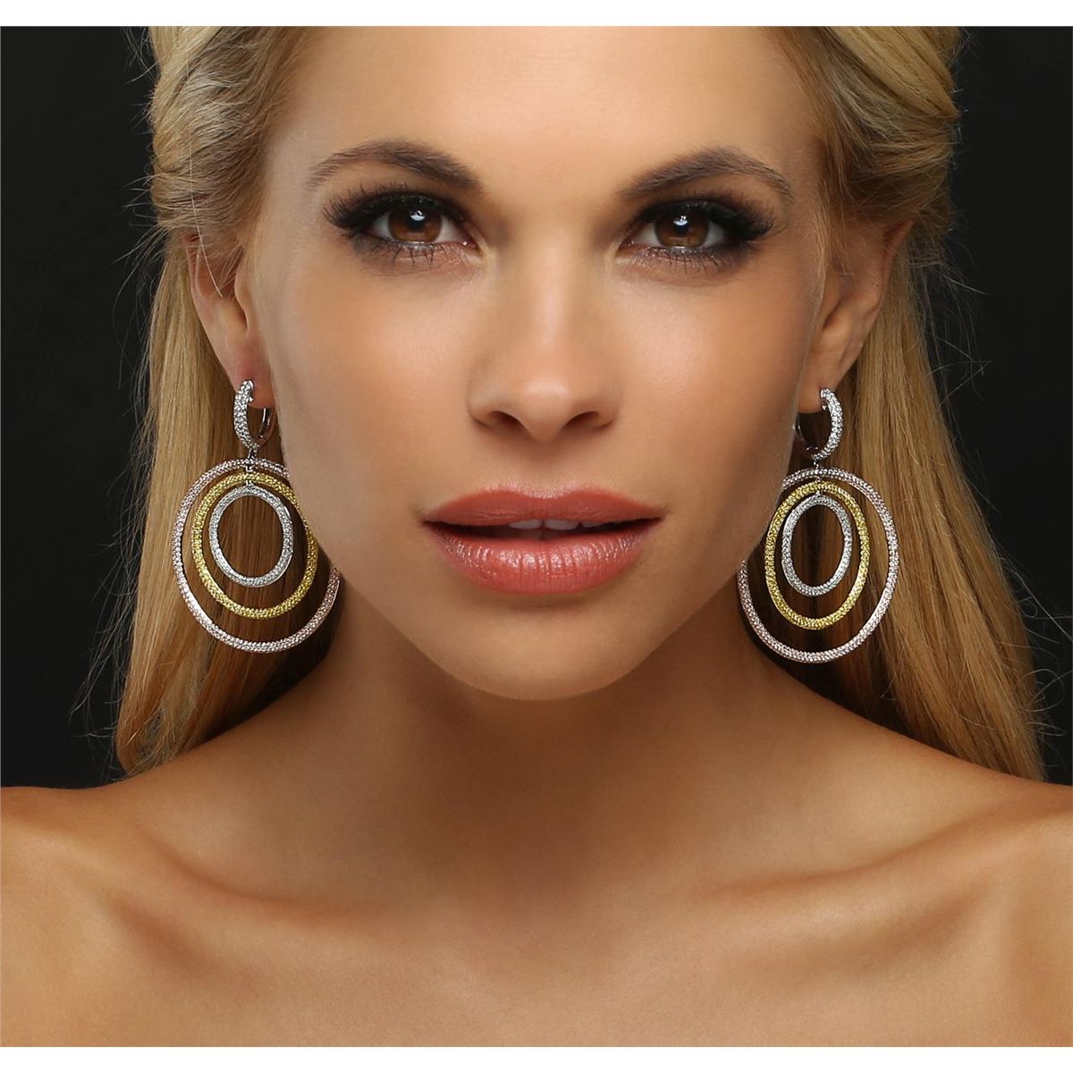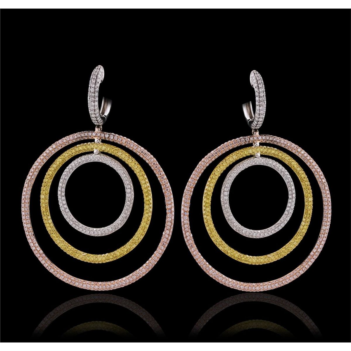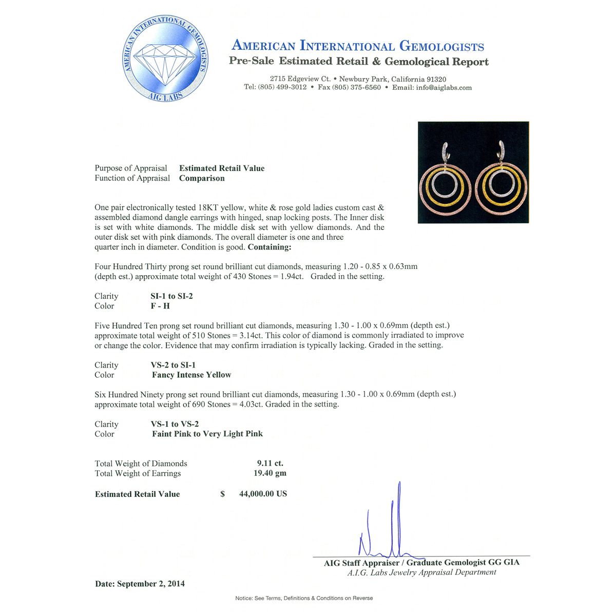One pair electronically tested 18KT yellow, white & rose gold ladies custom cast & assembled diamond dangle earrings with hinged, snap locking posts. The Inner disk is set with white diamonds. The middle disk set with yellow diamonds. And the outer disk set with pink diamonds. The overall diameter is one and three quarter inch in diameter. Condition is good. Containing: Four Hundred Thirty prong set round brilliant cut diamonds, measuring 1.20 - 0.85 x 0.63mm (depth est.) approximate total weight of 430 Stones = 1.94ct. Graded in the setting. Clarity: SI-1 to SI-2. Color: F - H Five Hundred Ten prong set round brilliant cut diamonds, measuring 1.30 - 1.00 x 0.69mm (depth est.) approximate total weight of 510 Stones = 3.14ct. This color of diamond is commonly irradiated to improve or change the color. Evidence that may confirm irradiation is typically lacking. Graded in the setting. Clarity: VS-2 to SI-1 Six Hundred Ninety prong set round brilliant cut diamonds, measuring 1.30 - 1.00 x 0.69mm (depth est.) approximate total weight of 690 Stones = 4.03ct. Faint Pink to very light pink. Graded in the setting. Clarity: VS-1 to VS-2. Total Weight of Diamonds 9.11ct. Total Weight of Earrings 19.40 grams. AIG Appraised at $44,000.00.