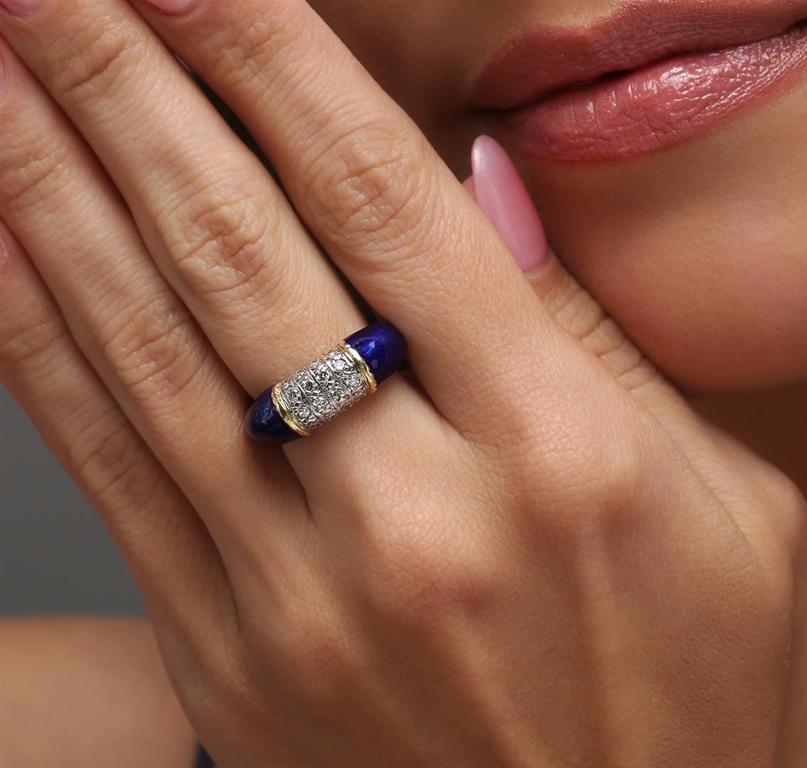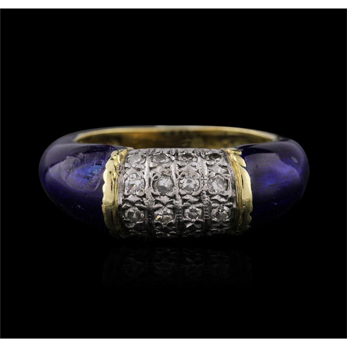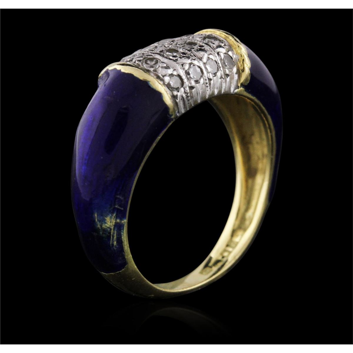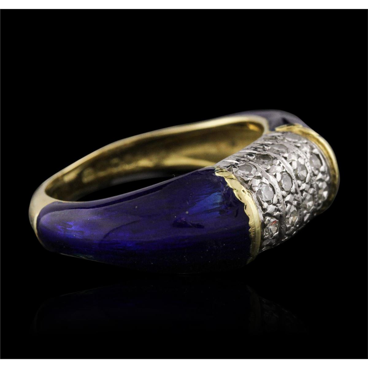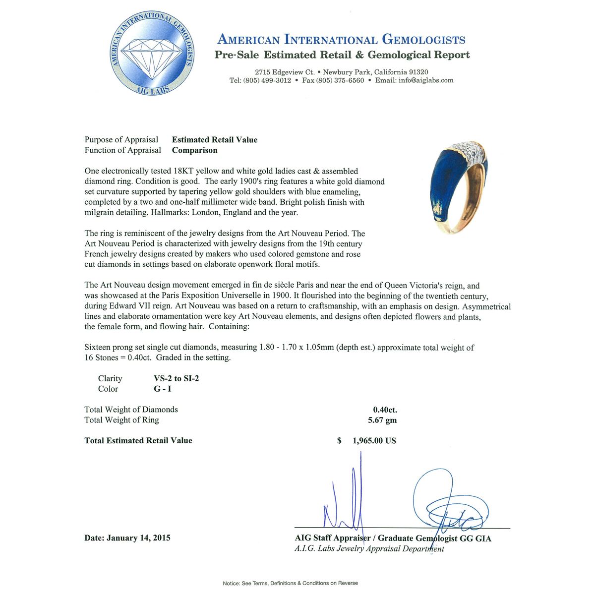 One electronically tested 18KT yellow and white gold ladies cast & assembled diamond ring. The early 1900's ring features a white gold diamond set curvature supported by tapering yellow gold shoulders with blue enameling, completed by a two and one-half millimeter wide band. Bright polish finish with milgrain detailing. Hallmarks: London, England and the year. The ring is reminiscent of the jewelry designs from the Art Nouveau Period. The Art Nouveau Period is characterized with jewelry designs from the 19th century French jewelry designs created by makers who used colored gemstone and rose cut diamonds in settings based on elaborate openwork floral motifs. The Art Nouveau design movement emerged in fin de siecle Paris and near the end of Queen Victoria's reign, and was showcased at the Paris Exposition Universelle in 1900. It flourished into the beginning of the twentieth century, during Edward VII reign. Art Nouveau was based on a return to craftsmanship, with an emphasis on design. Asymmetrical lines and elaborate ornamentation were key Art Nouveau elements, and designs often depicted flowers and plants, the female form, and flowing hair. Condition is good. Containing: Sixteen prong set single cut diamonds, measuring 1.80 - 1.70 x 1.05mm (depth est.) approximate total weight of 16 Stones = 0.40ct. Graded in the setting. Clarity: VS-2 to SI-2. Color: G - I. Total Weight of Diamonds 0.40ct. Total Weight of Ring 5.67 grams. AIG Appraised.