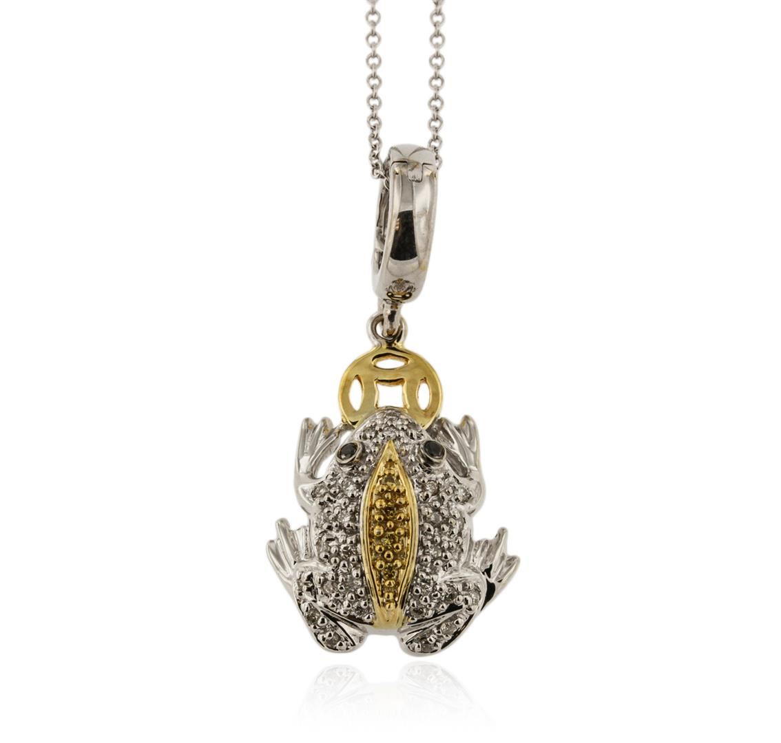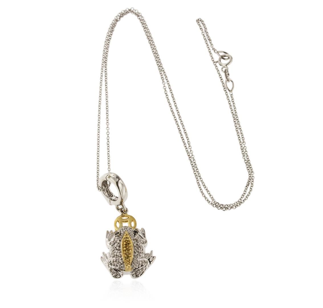 One frog pendant with chain featuring: 18KT white and yellow gold weighing 6.70 grams containing black diamonds with a total weight of 0.10ct and diamonds with a total weight of 0.35ct.