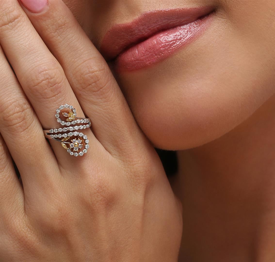 One ring featuring: 14KT two-tone gold weighing 4.70 grams containing prong set white and fancy yellow diamonds with a total weight of 0.60ct.