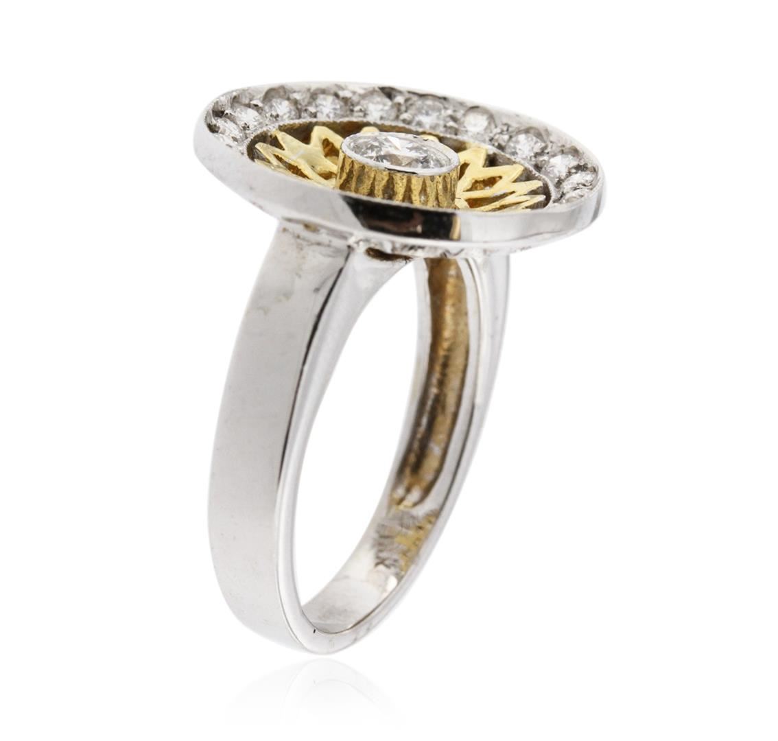 One electronically tested 18KT white and yellow gold ladies cast diamond ring with a bright polish finish. Identified with markings of "18K". Condition is new. Containing: One bezel set round brilliant cut diamond, measuring 4.00 - 4.00 x 2.40mm (depth est.) approximate weight of 0.23ct. Clarity: I-1. Color: G, Cut is Good. Twenty prong set round brilliant cut diamonds, measuring 1.80 - 1.80 x 1.08mm (depth est.) approximate total weight of 20 Stones = 0.43ct. Clarity: SI-1. Color: G - H, Cut is Good. All diamonds are graded in the mounting, unless otherwise stated. Total Weight of Diamonds 0.66ct. Total Weight of Ring 8.00 grams. GGL Appraised at $3,425.00.
