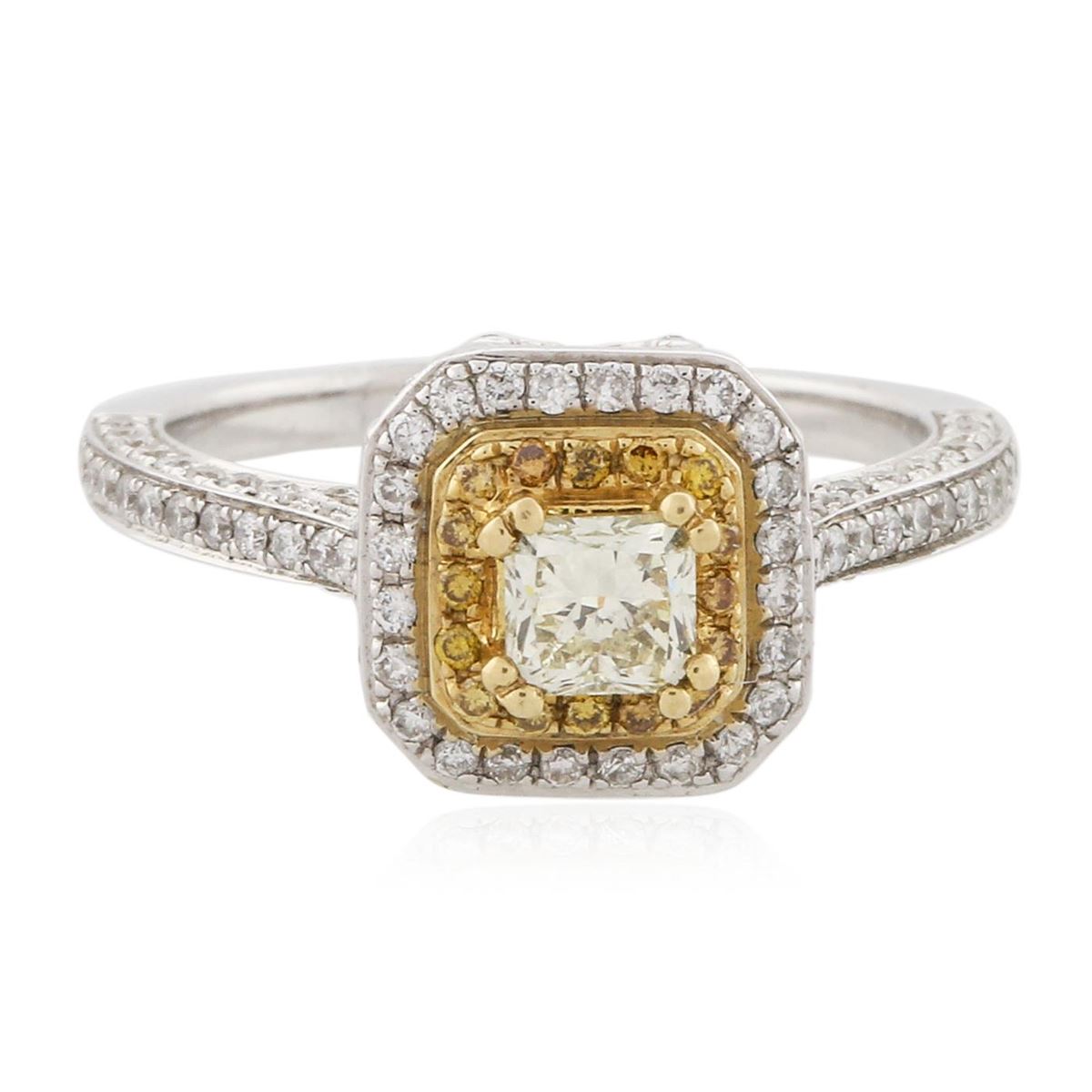 One electronically tested 18KT white and yellow gold ladies cast diamond engagement ring with a bright polish finish. Identified with markings of "18K". Condition is new. Containing: One prong set radiant shaped cut diamond, measuring 4.00. x 3.90 x 2.61mm (depth est.) approximate weight of 0.33ct. Clarity: VS-2, Cut is Good. One Hundred Thirty-Seven prong set round brilliant cut diamonds, measuring 1.00. - 1.00. x 0.60mm (depth est.) approximate total weight of 137 Stones = 0.49ct. Clarity: SI-2 to I-1. Color: I, Cut is Good. Sixteen prong set round brilliant cut diamonds, measuring 1.00. - 1.00. x 0.60mm (depth est.) approximate total weight of 16 Stones = 0.06ct. Clarity: SI-1 to SI-2, Cut is Good. All diamonds are graded in the mounting, unless otherwise stated. Total Weight of Diamonds 0.89ct. Total Weight of Engagement Ring 5.10 grams. GGL Appraised at $4,060.00.