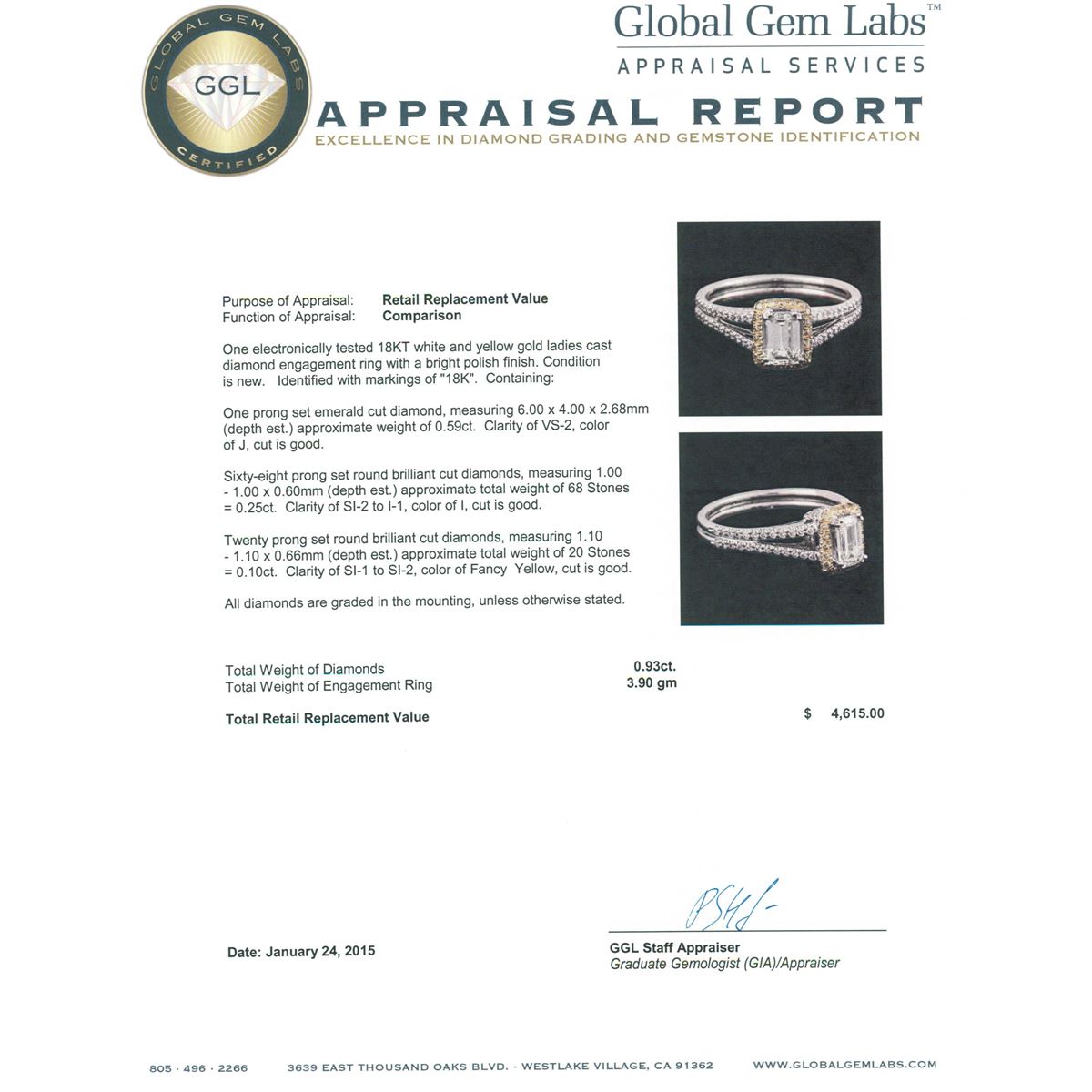 One electronically tested 18KT white and yellow gold ladies cast diamond engagement ring with a bright polish finish. Identified with markings of "18K". Condition is new. Containing: One prong set emerald cut diamond, measuring 6.00. x 4.00. x 2.68mm (depth est.) approximate weight of 0.59ct. Clarity: VS-2. Color: J, Cut is Good. Sixty-Eight prong set round brilliant cut diamonds, measuring 1.00. - 1.00. x 0.60mm (depth est.) approximate total weight of 68 Stones = 0.25ct. Clarity: SI-2 to I-1. Color: I, Cut is Good. Twenty prong set round brilliant cut diamonds, measuring 1.10 - 1.10 x 0.66mm (depth est.) approximate total weight of 20 Stones = 0.10ct. Clarity: SI-1 to SI-2, Cut is Good. All diamonds are graded in the mounting, unless otherwise stated. Total Weight of Diamonds 0.93ct. Total Weight of Engagement Ring 3.90 grams. GGL Appraised at $4,615.00.