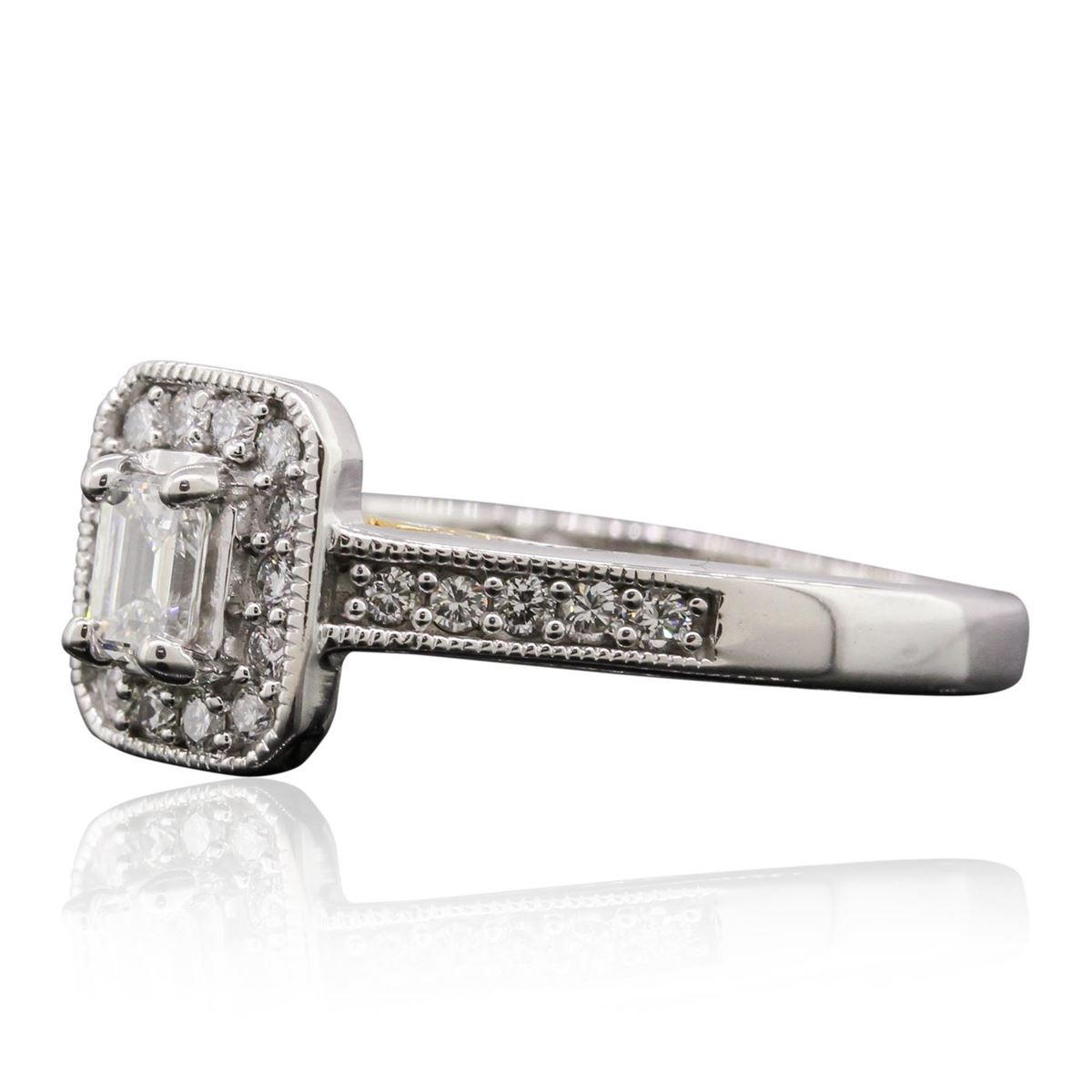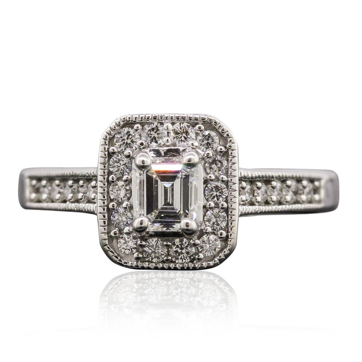 One pave set round diamond halo ring featuring: 18KT Two-Tone Gold weighing a total of 11.10 grams and diamonds with a total weight of 1.00ctw.