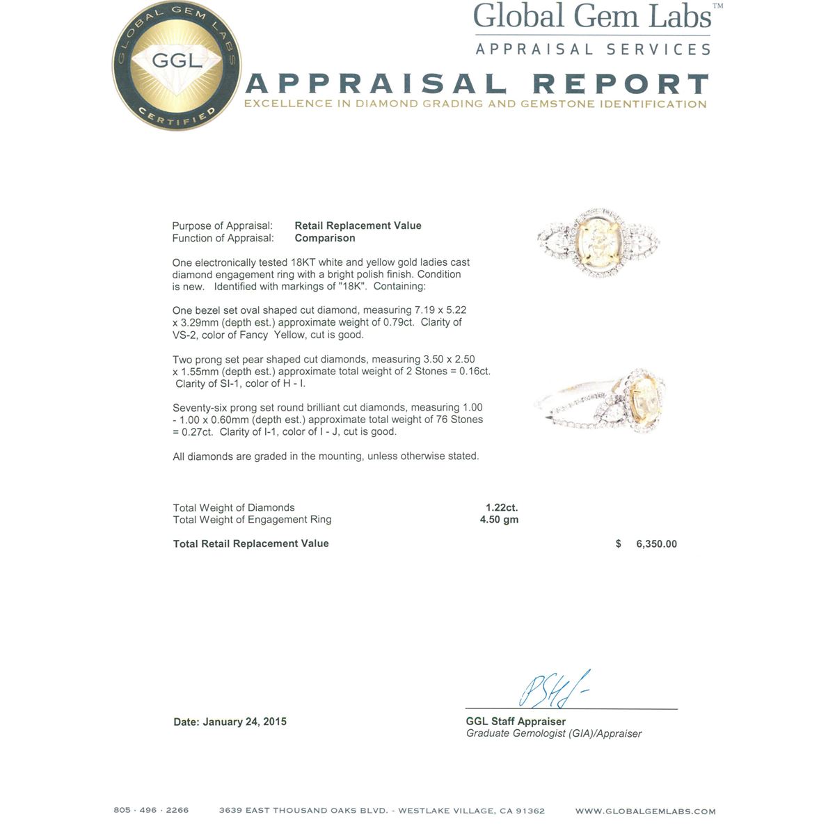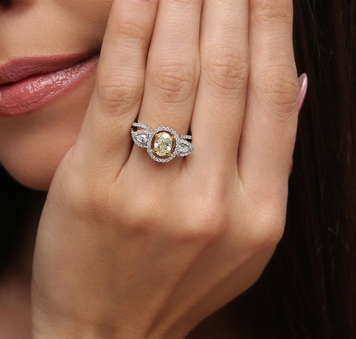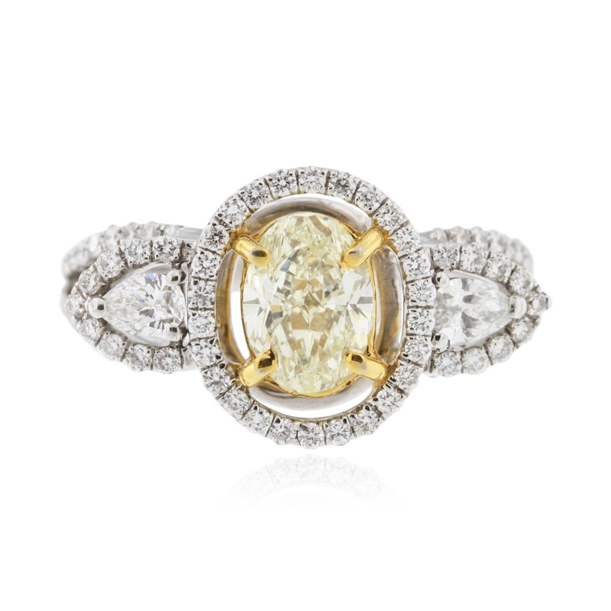 One electronically tested 18KT white and yellow gold ladies cast diamond engagement ring with a bright polish finish. Identified with markings of "18K". Condition is new. Containing: One bezel set oval shaped cut diamond, measuring 7.19 x 5.22 x 3.29mm (depth est.) approximate weight of 0.79ct. Clarity: VS-2, Cut is Good. Two prong set pear shaped cut diamonds, measuring 3.50 x 2.50 x 1.55mm (depth est.) approximate total weight of 2 Stones = 0.16ct. Clarity: SI-1. Color: H - I. Seventy-Six prong set round brilliant cut diamonds, measuring 1.00 - 1.00 x 0.60mm (depth est.) approximate total weight of 76 Stones = 0.27ct. Clarity: I-1. Color: I - J, Cut is Good. All diamonds are graded in the mounting, unless otherwise stated. Total Weight of Diamonds 1.22ct. Total Weight of Engagement Ring 4.50 grams. GGL Appraised at $6,350.00.