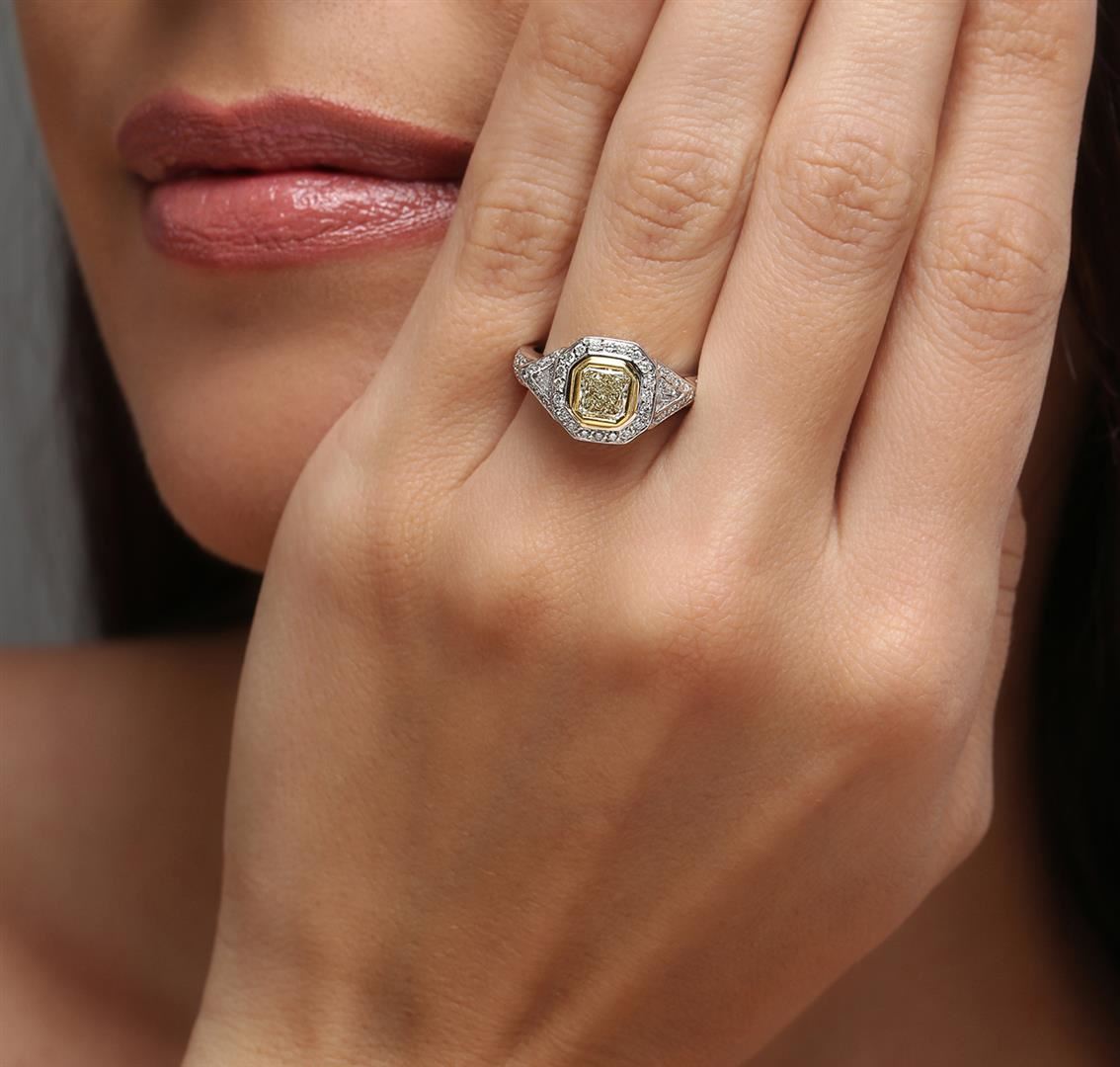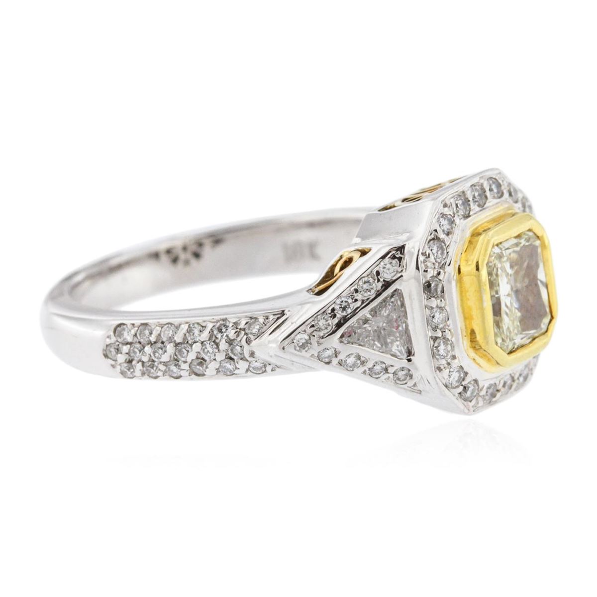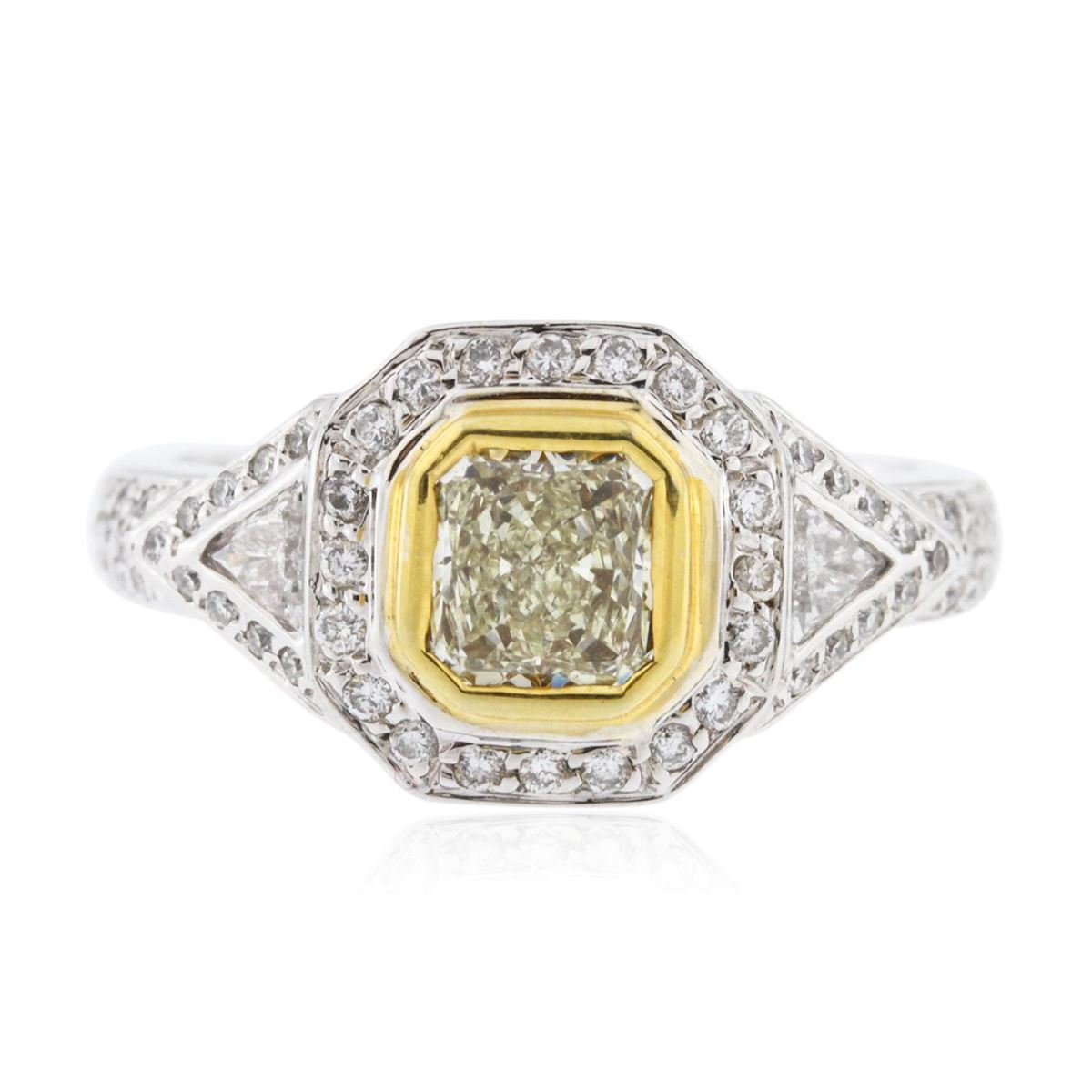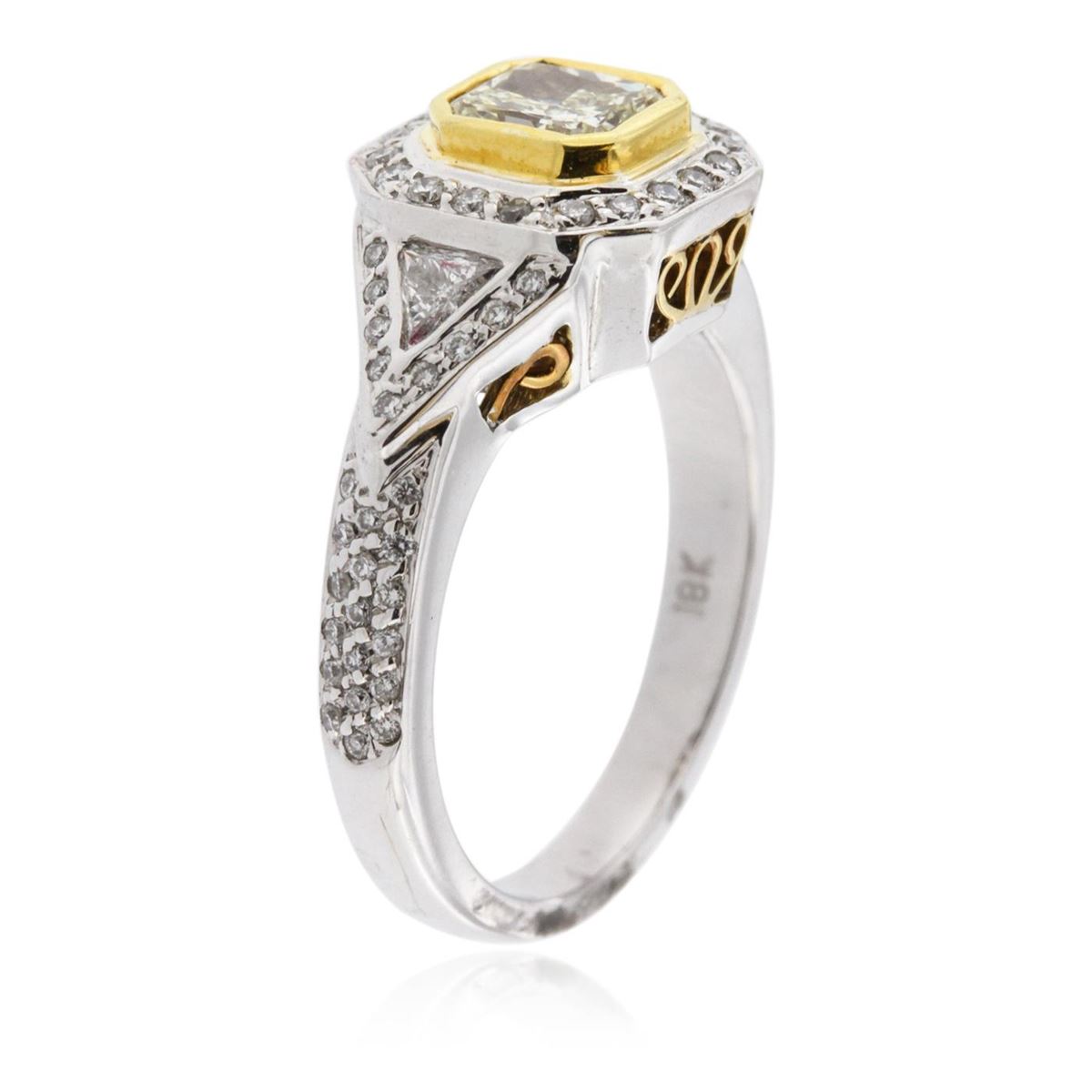 One electronically tested 18KT white and yellow gold ladies cast diamond engagement ring with a bright polish finish. Identified with markings of "18K". Condition is new. Containing: One bezel set radiant shaped cut diamond, measuring 5.00. x 5.00. x 3.75mm (depth est.) approximate weight of 0.77ct. Clarity: VS-2, Cut is Good. Two bezel set triangle cut diamonds, measuring 3.00. x 3.00. x 1.86mm (depth est.) approximate total weight of 2 Stones = 0.19ct. Clarity: SI-1. Color: H - I. Seventy-Four prong set round brilliant cut diamonds, measuring 1.00. - 1.00. x 0.60mm (depth est.) approximate total weight of 74 Stones = 0.27ct. Clarity: I-1 to I-2. Color: I - J, Cut is Good. All diamonds are graded in the mounting, unless otherwise stated. Total Weight of Diamonds 1.23ct. Total Weight of Engagement Ring 8.20 grams. GGL Appraised at $6,325.00.
